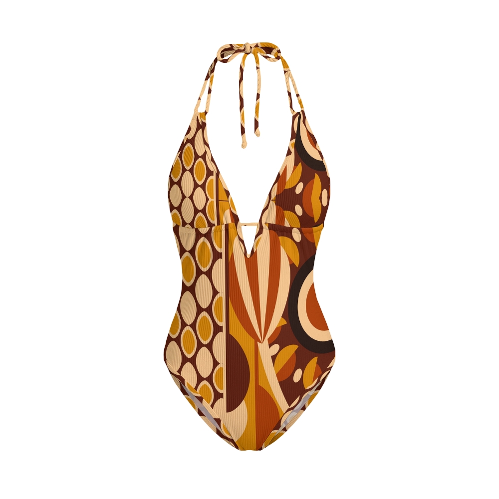 Retro Geometric Print V Neck One-Piece Swimsuit