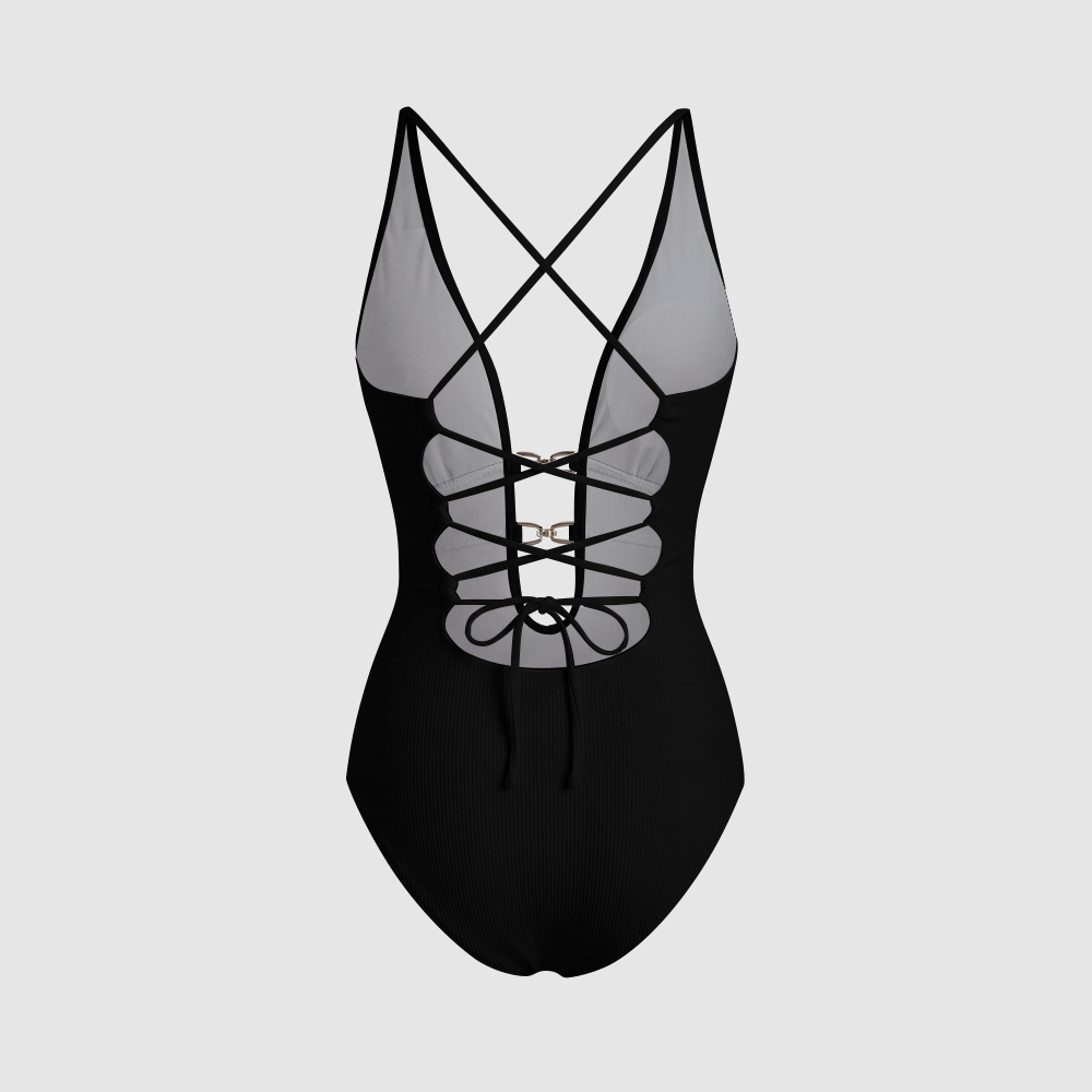 Solid Black Deep V Metal Buckle Open Back One-Piece Swimsuit