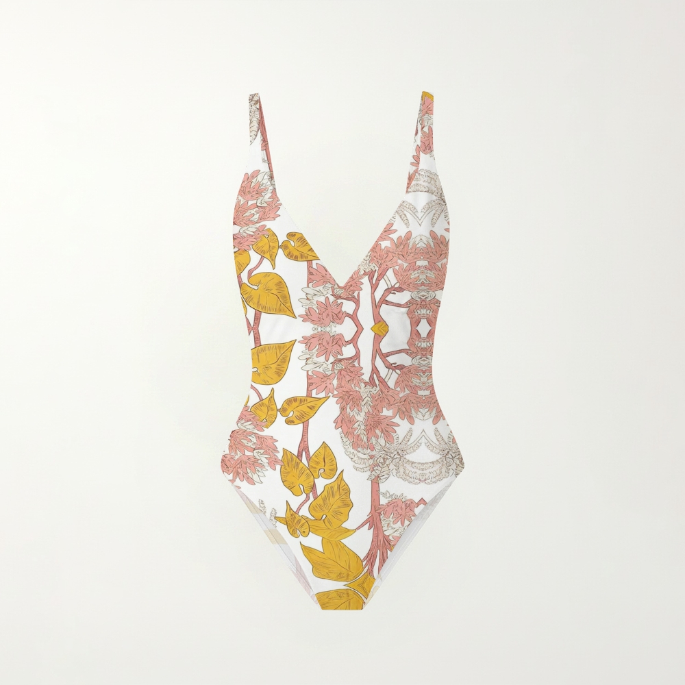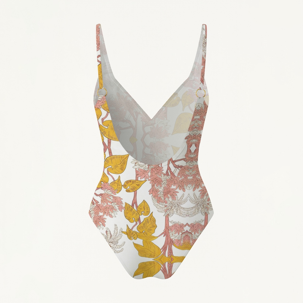 Tropical Plant Print Deep V Neck Open Back One Piece Swimsuit