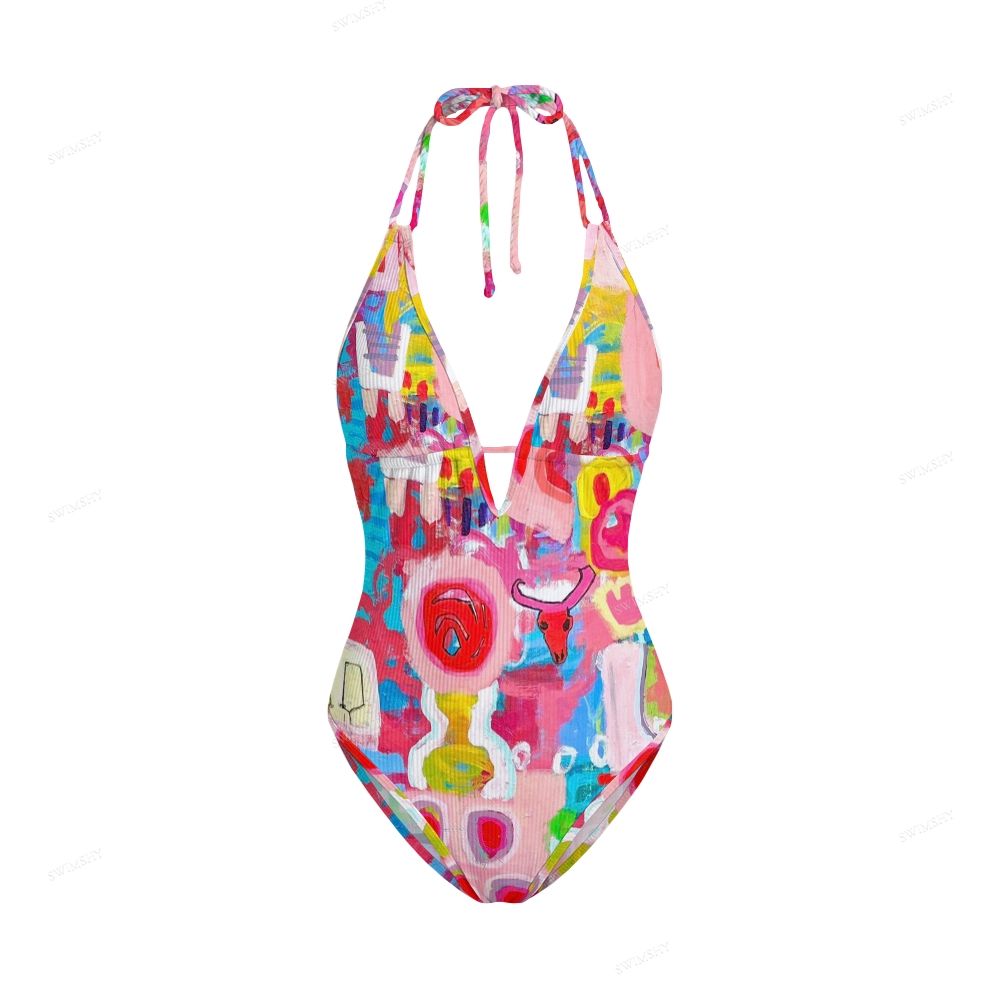 Vibrant Abstract Art Print Contrast V Neck One-Piece Swimsuit