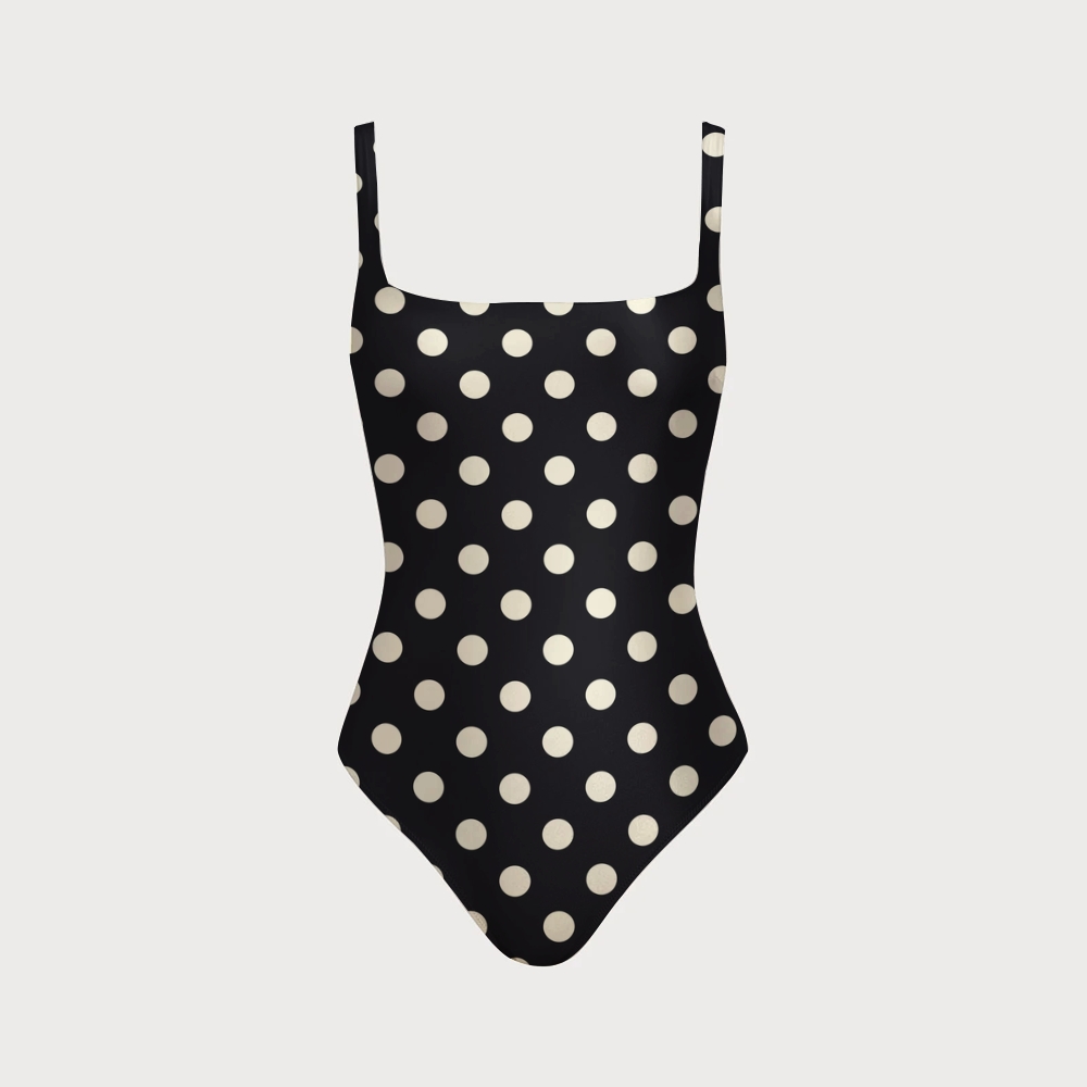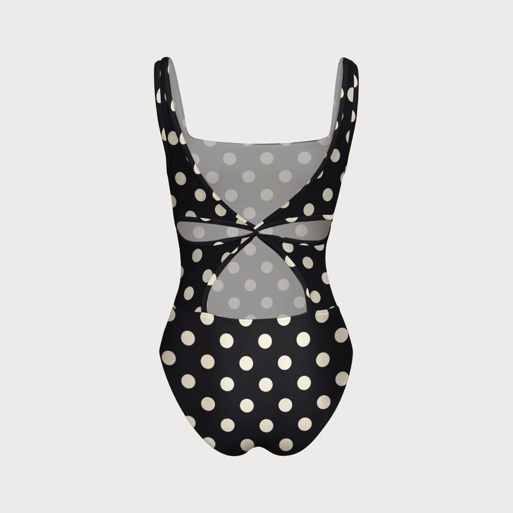 Women's Black And White Polka Dot Print One-piece Swimsuit With Back Mesh Knot