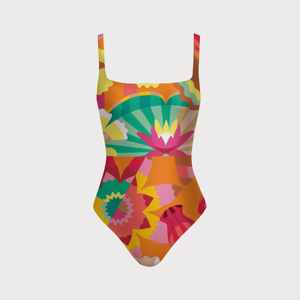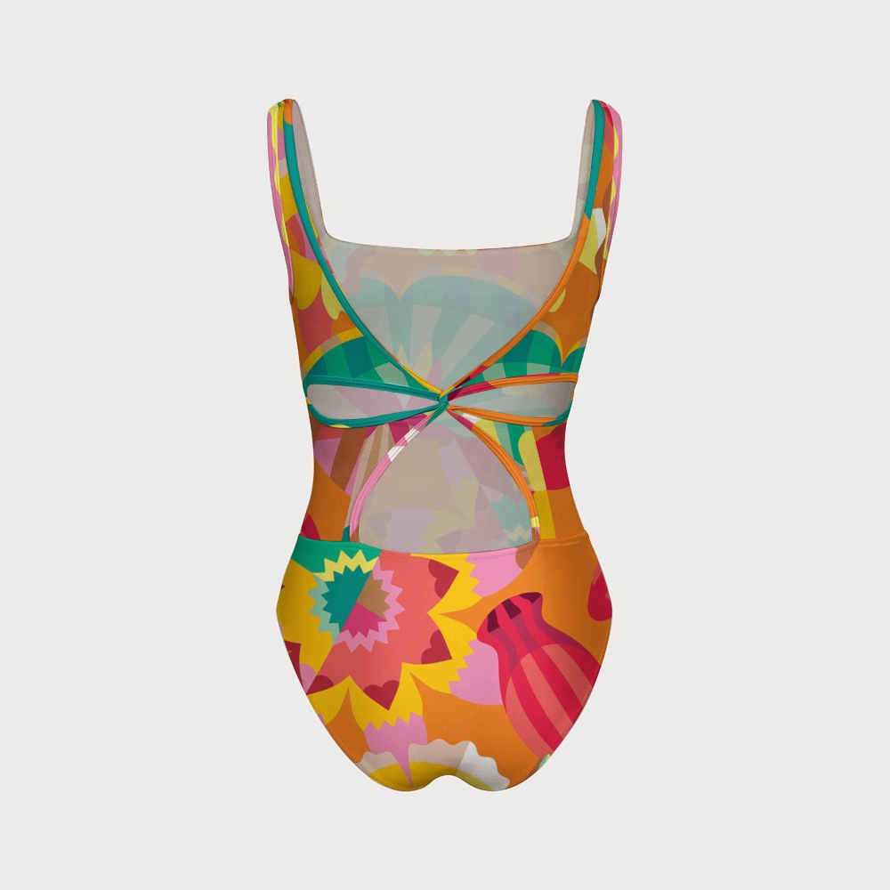 Women's Bold Floral Geometric Print One-piece Swimsuit With Back Mesh Knot