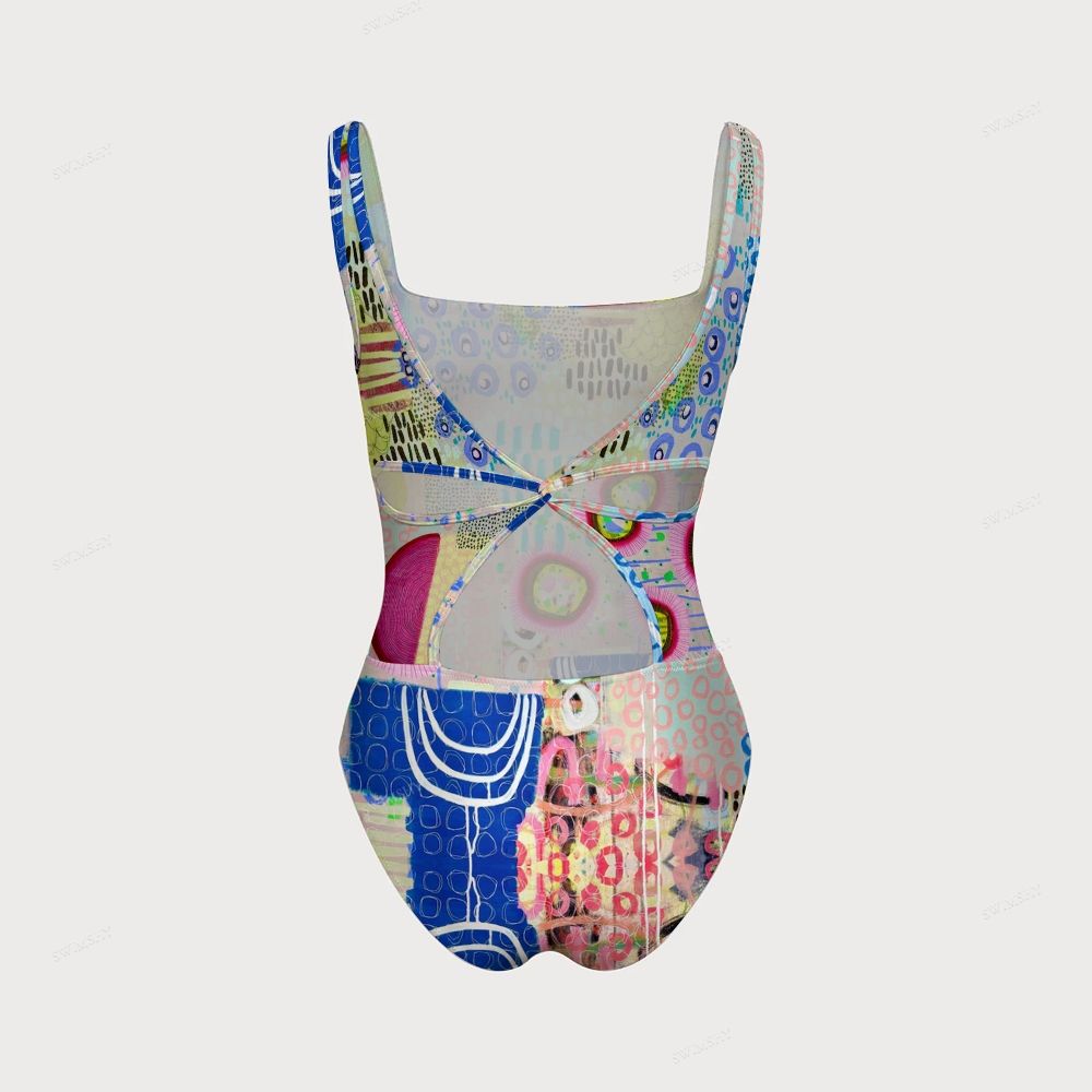 Women's Colorful Doodle Print One-piece Swimsuit With Back Mesh Knot