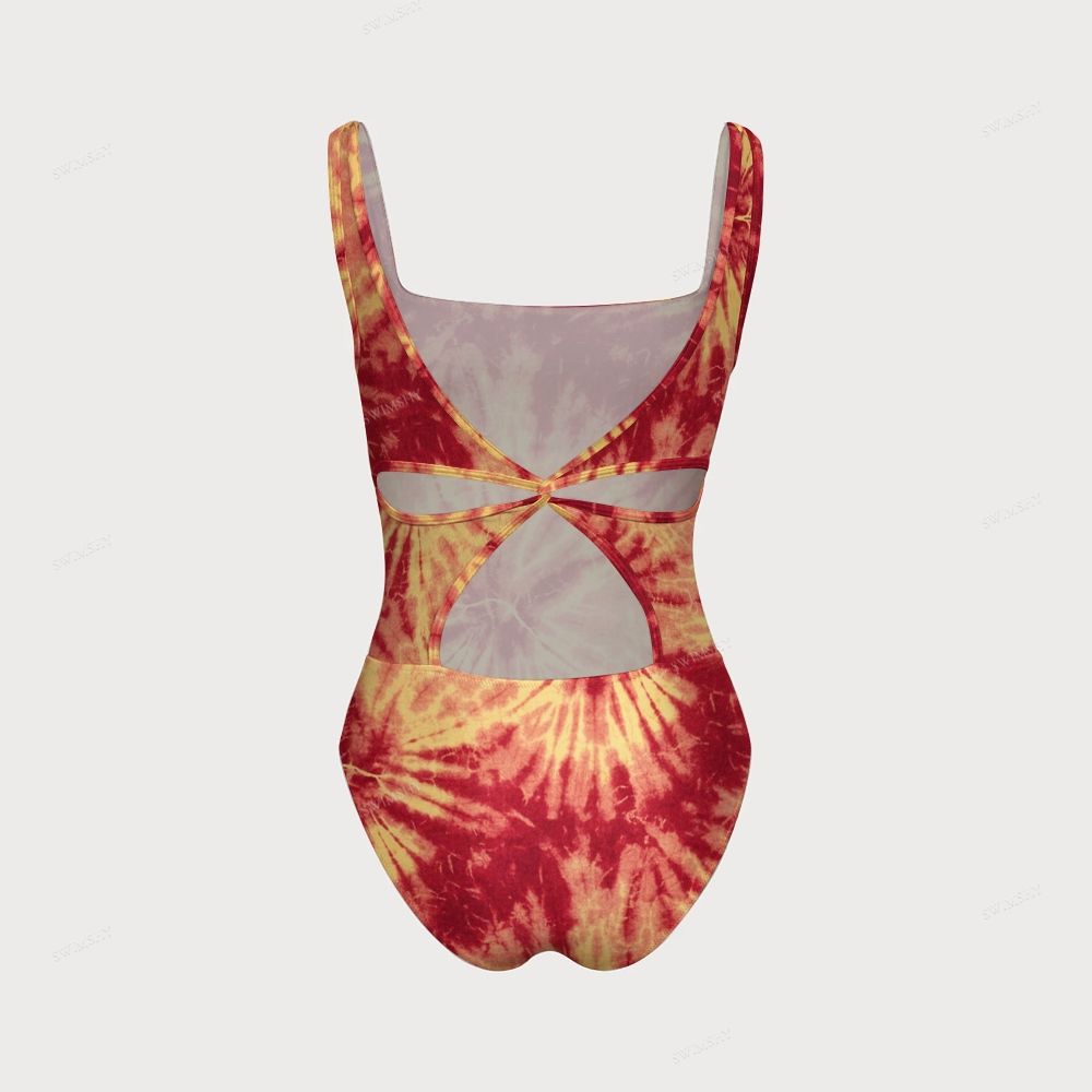 Women's Red Yellow Tie-Dye Print One-piece Swimsuit With Back Mesh Knot