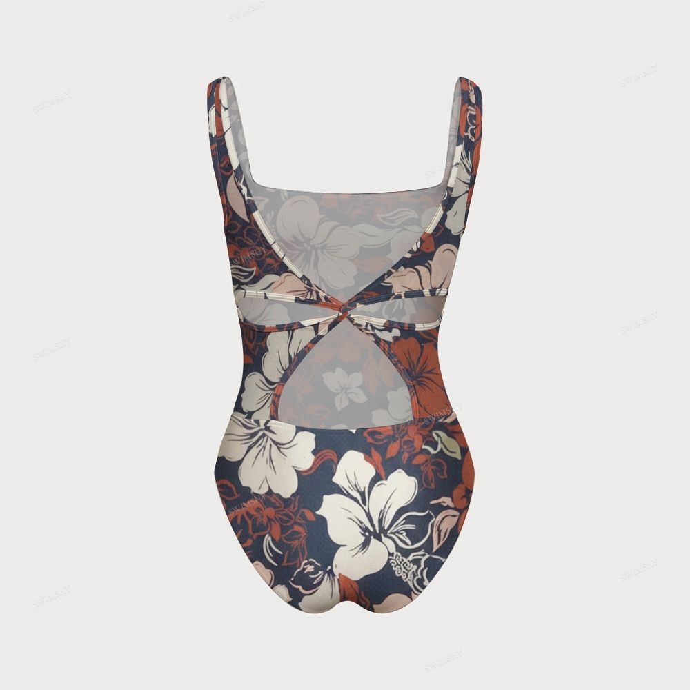 Women's Tropical Hibiscus Print One-piece Swimsuit With Back Mesh Knot