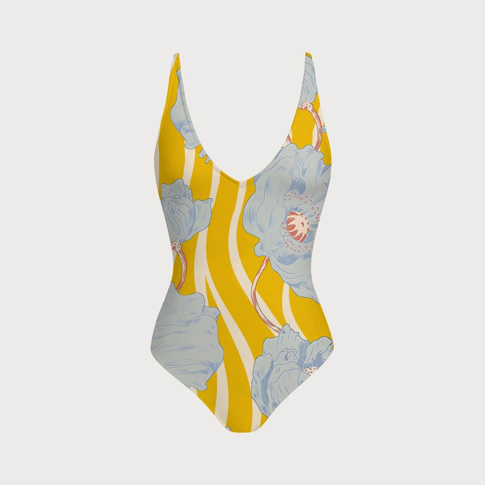 Yellow Blue Flower Deep V Cross Lace Up Open Back One-Piece Swimsuit