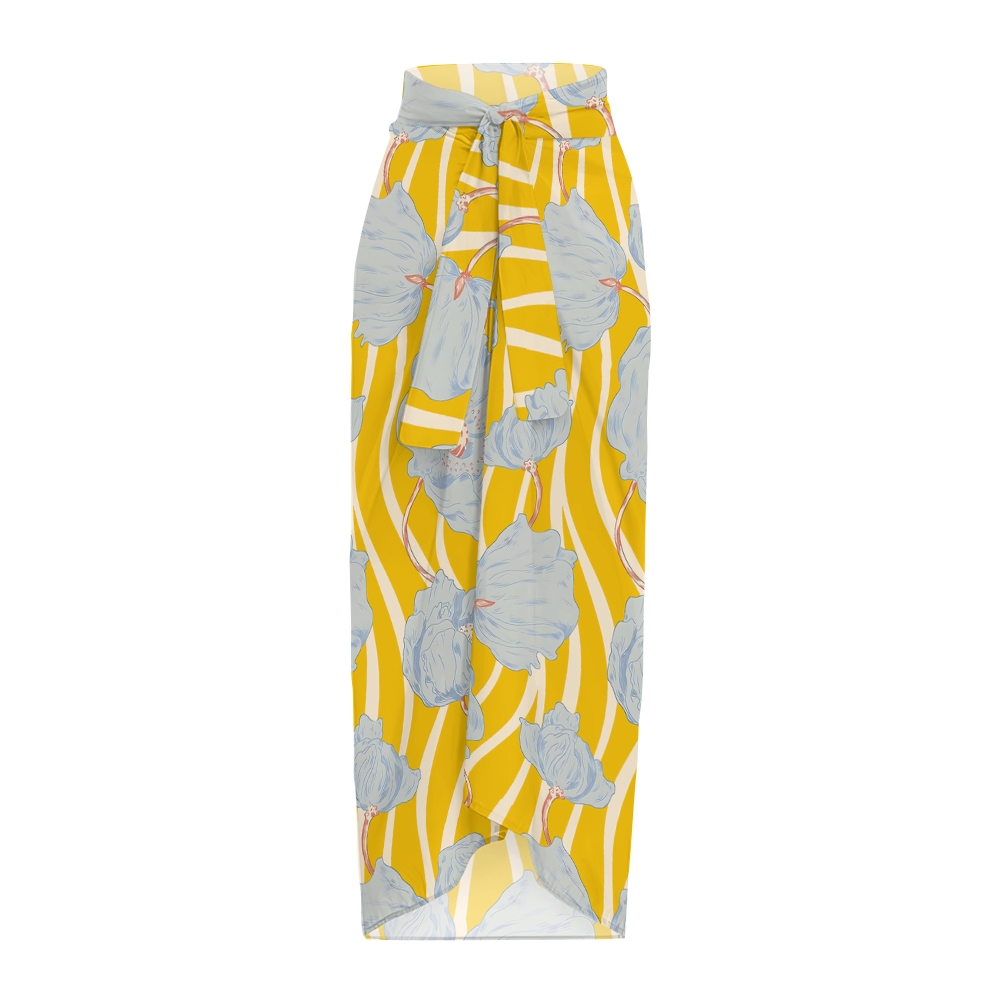 Yellow Blue Flower V Neck Tie One-Piece Swimsuit Set With Matching Skirt