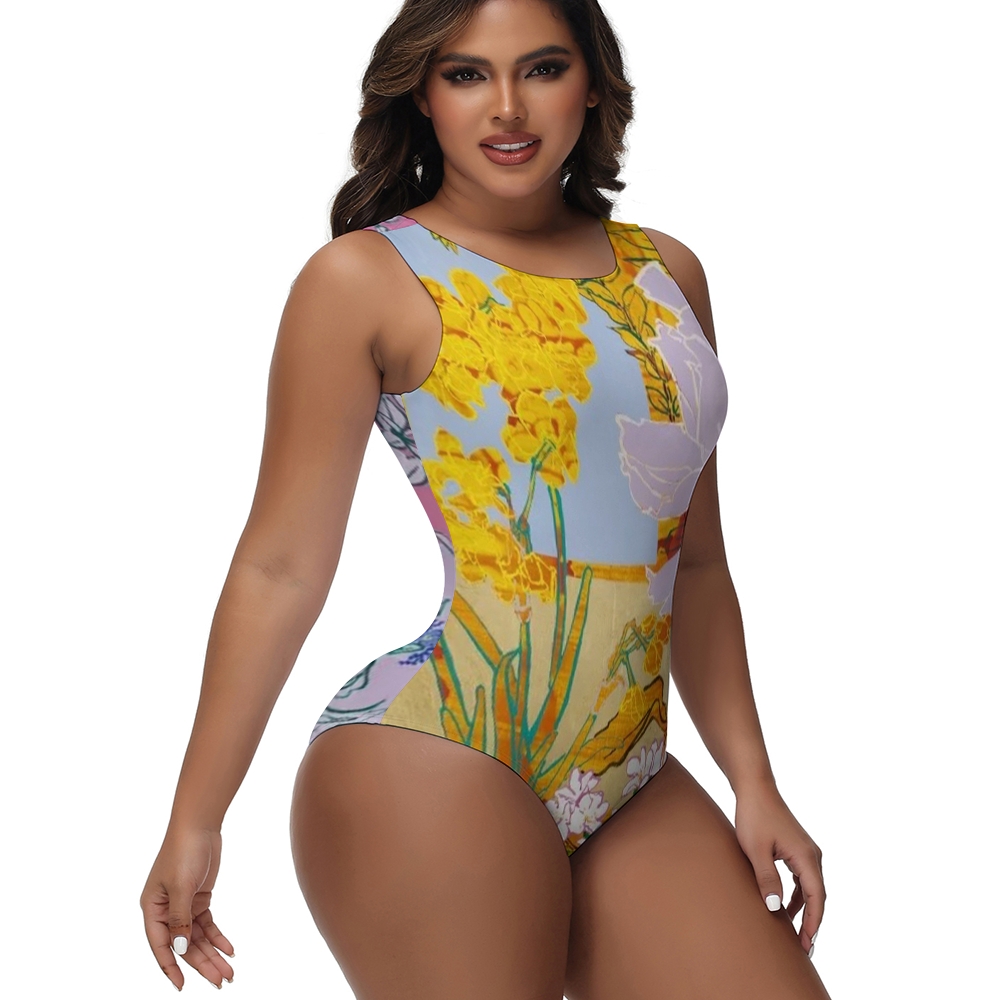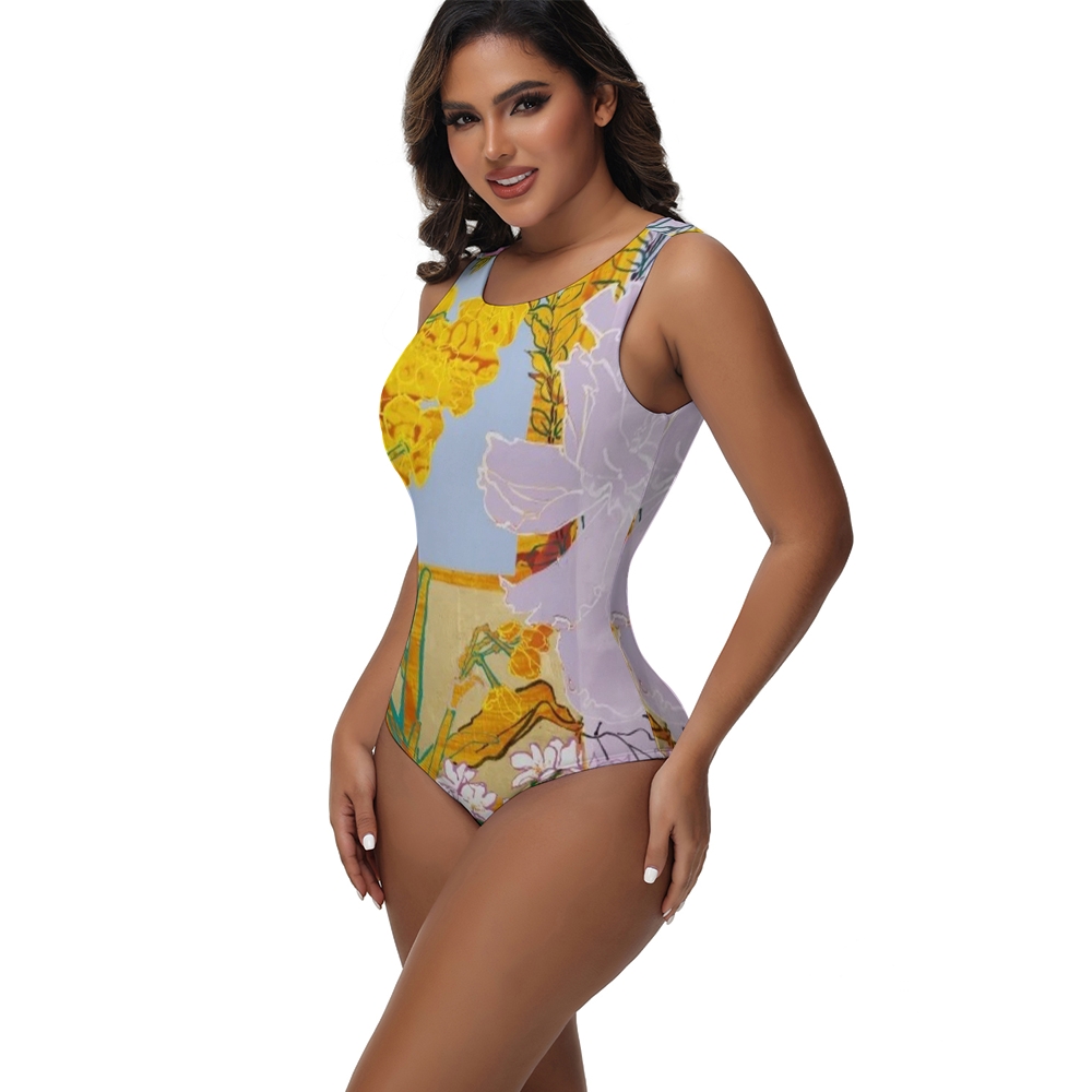 Yellow Lavender Floral Print One-Piece Swimsuit