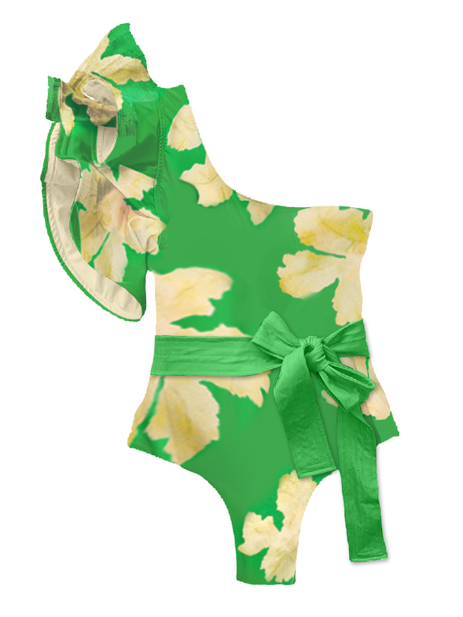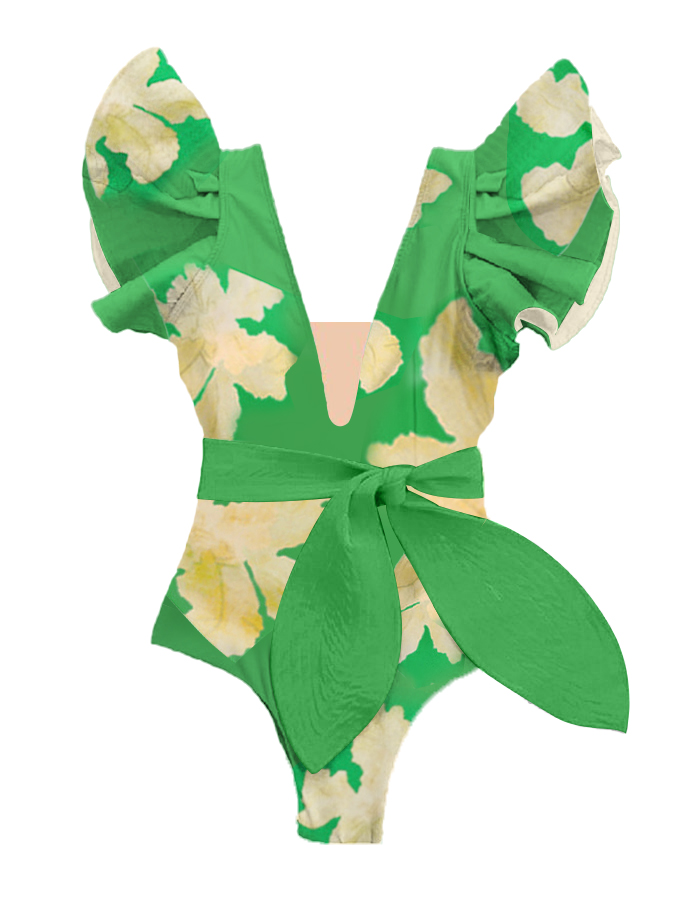 Ruffled Floral Colorblock Print Swimsuit and Cover-up