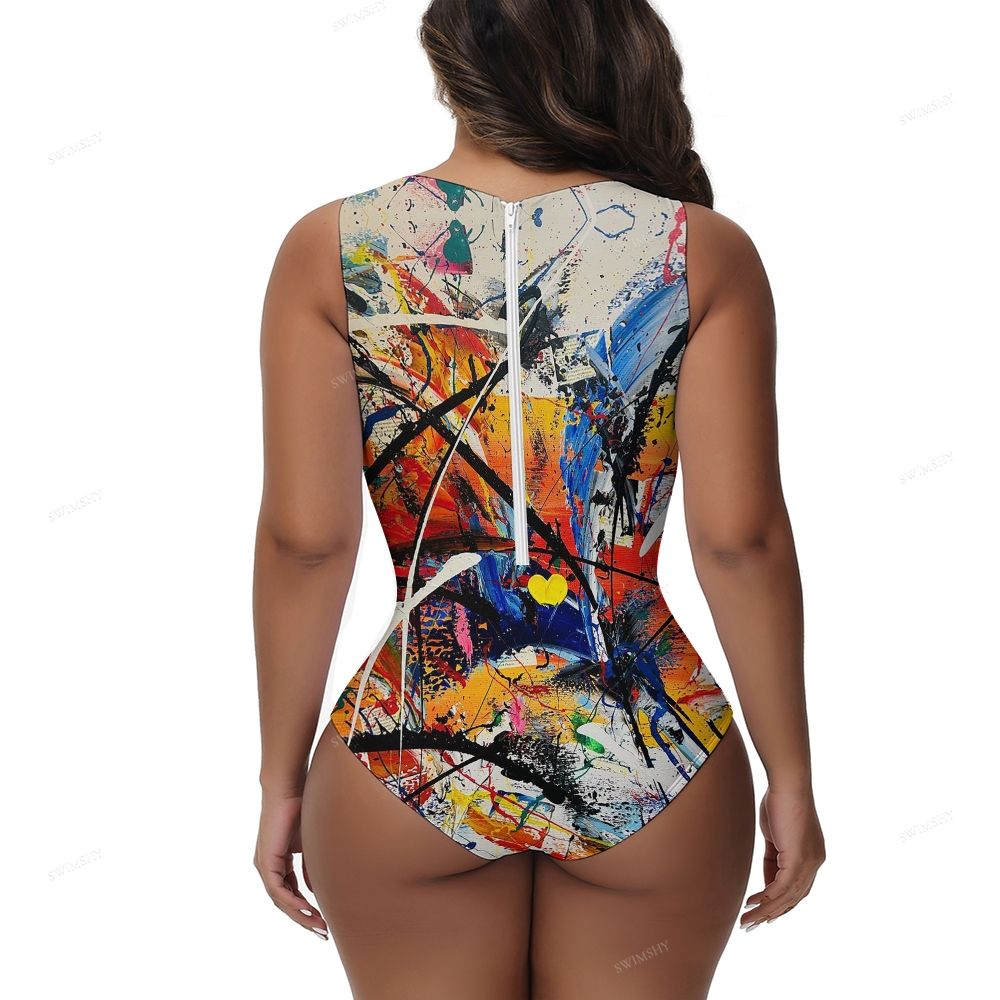Abstract Graffiti Paint Print High Neck Back Zip One Piece Swimsuit