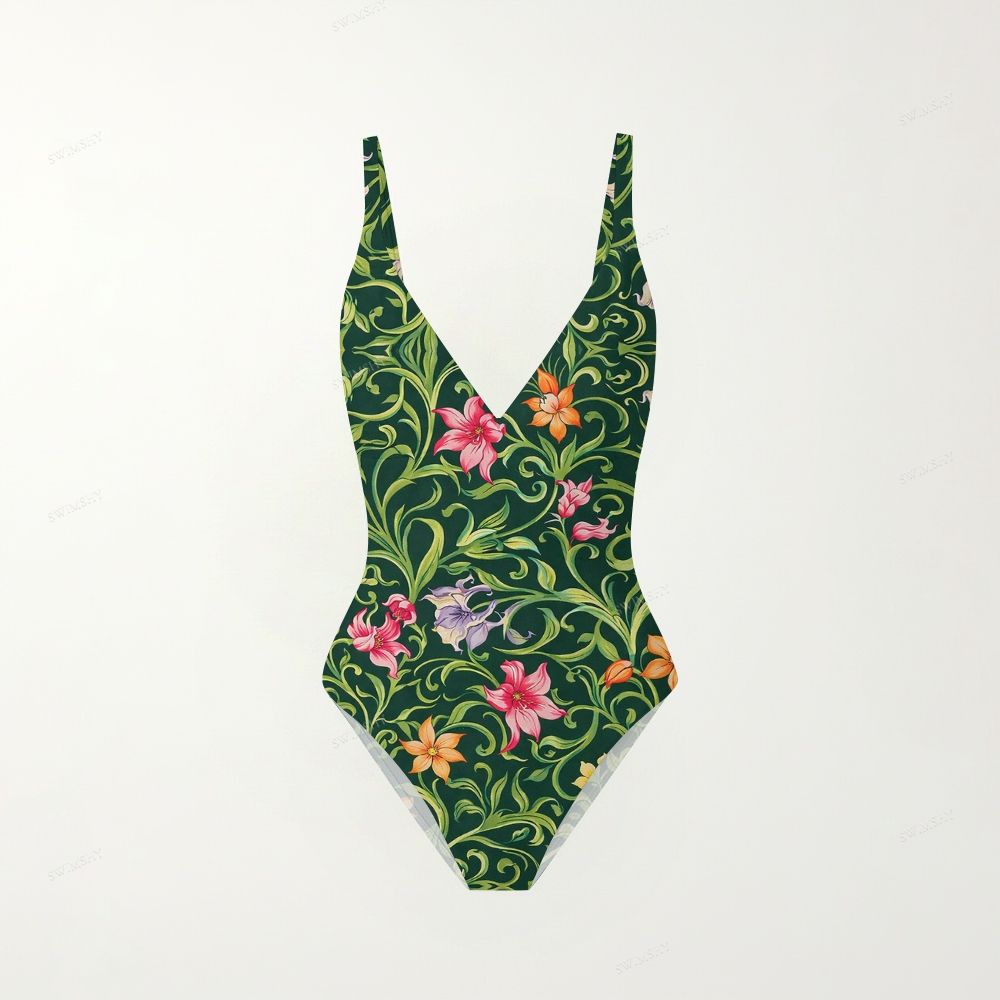 Baroque Floral Print V Neck Low Back One Piece Swimsuit