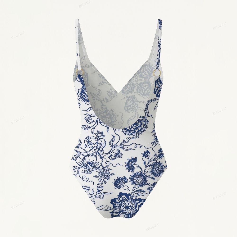 Blue and White Porcelain Floral Print V Neck Low Back One Piece Swimsuit