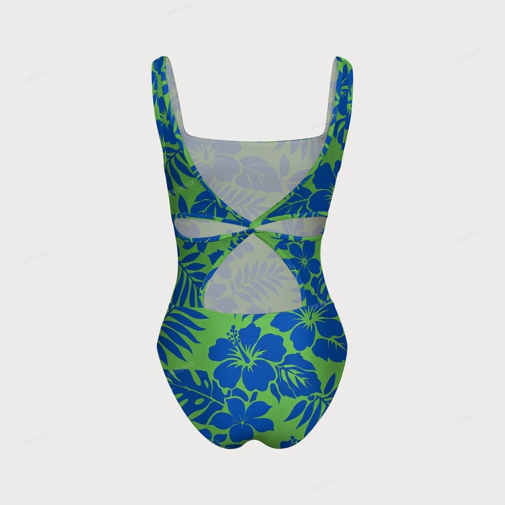 Blue Hibiscus Tropical Print Square Neck Cross Backless One Piece Swimsuit