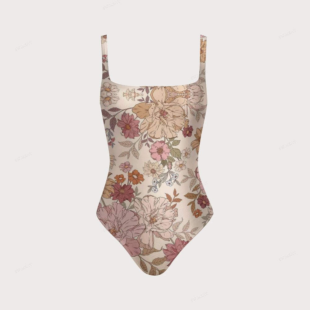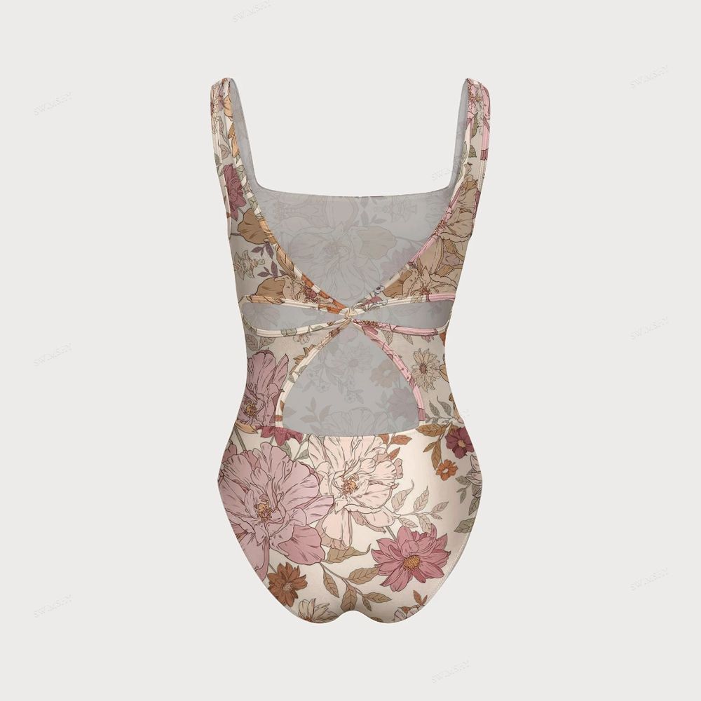 Boho Floral Print Square Neck Cross Backless One Piece Swimsuit