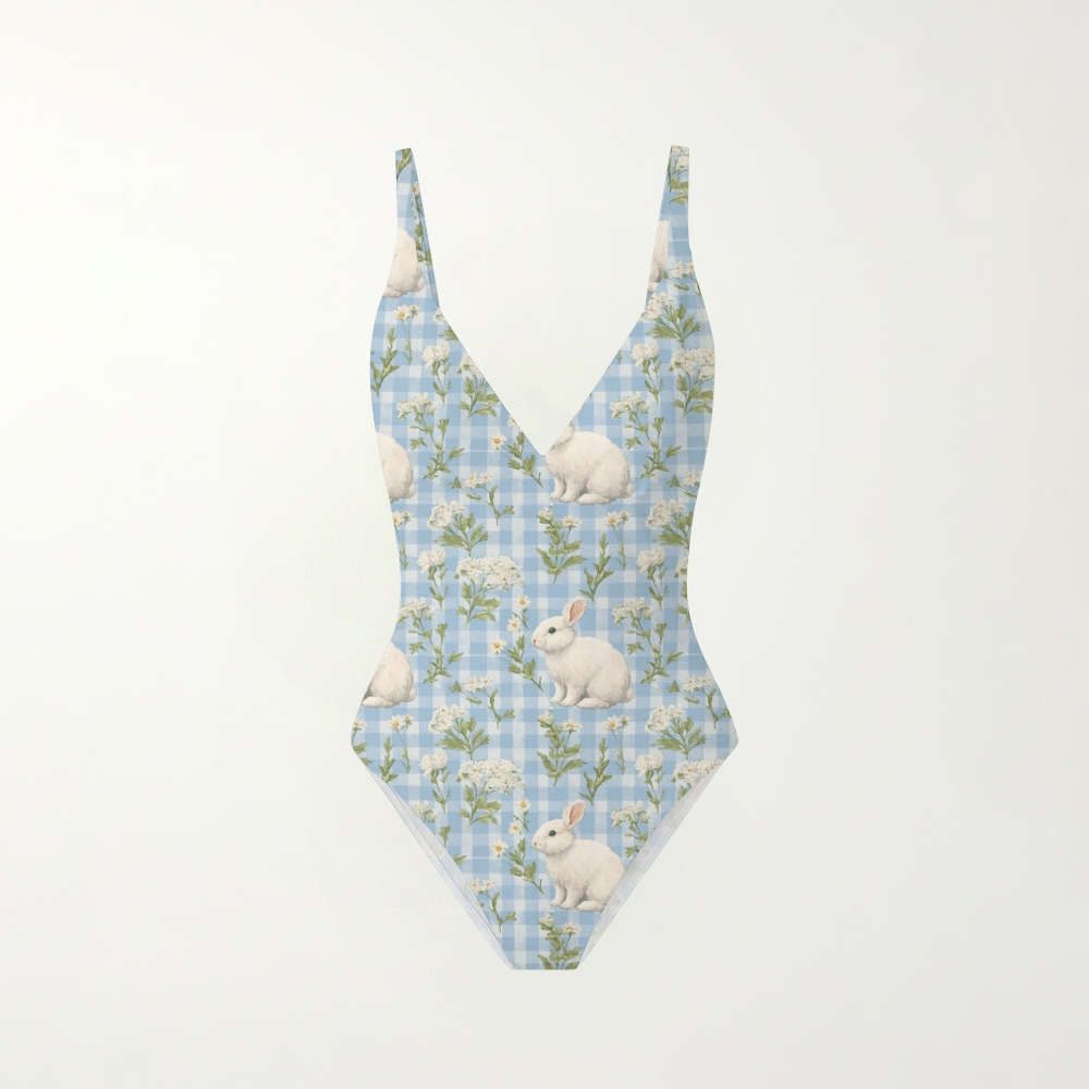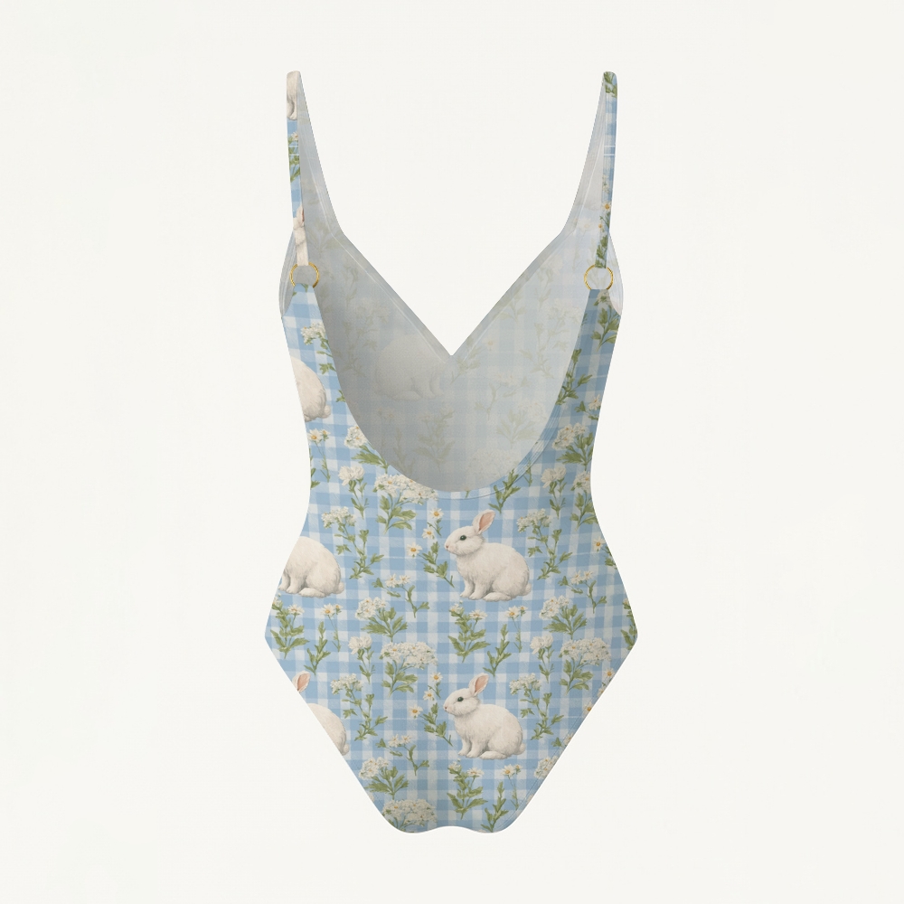 Bunny Gingham Floral Print Plunging V-Back One-Piece Swimsuit