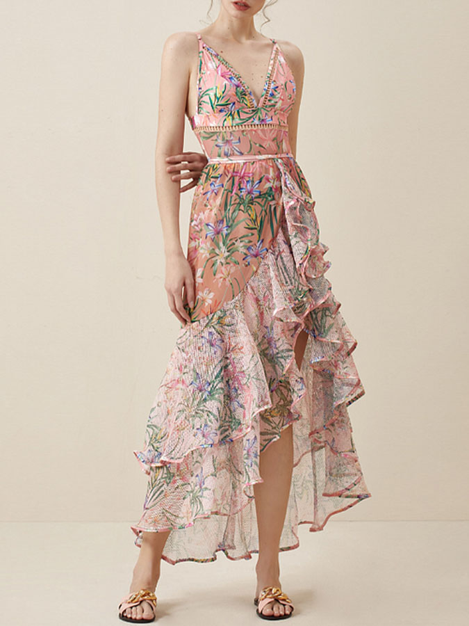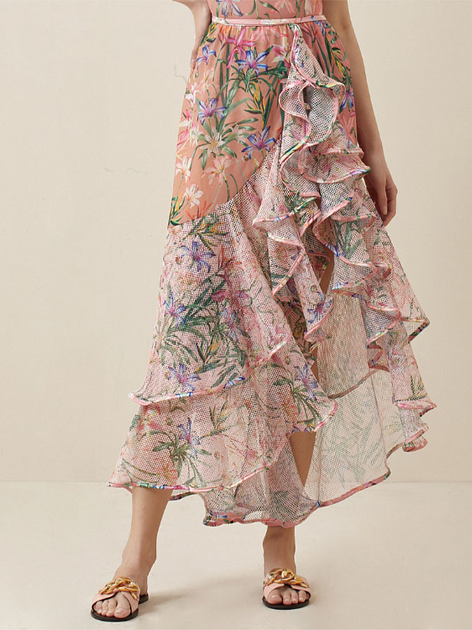 Floral Print One Piece Swimsuit and Mesh Splicing Sarong