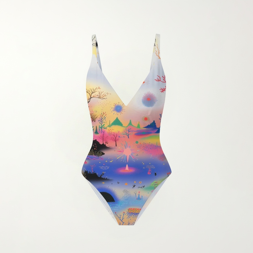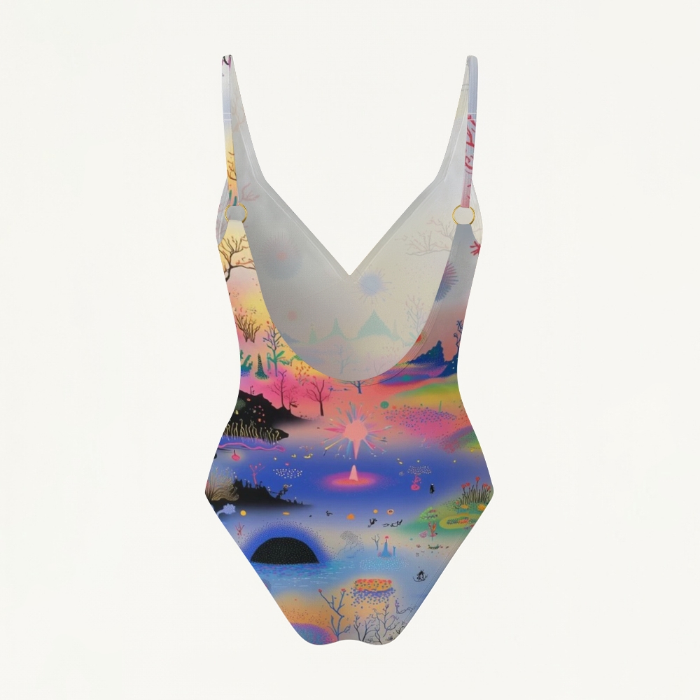 Gradient Fantasy Mountain Print Plunging V-Back One-Piece Swimsuit