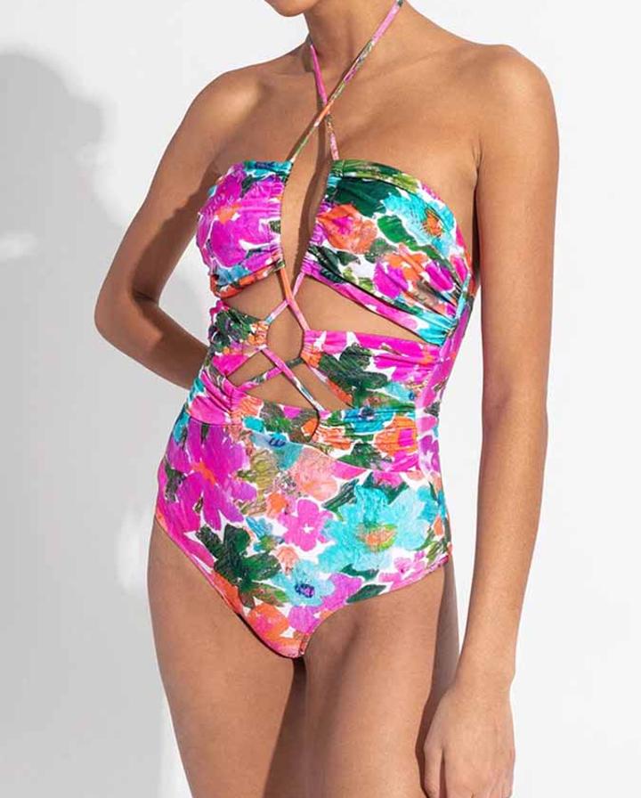 Halter Straps Cutout Floral Doodle One-Piece Swimsuit and Skirt