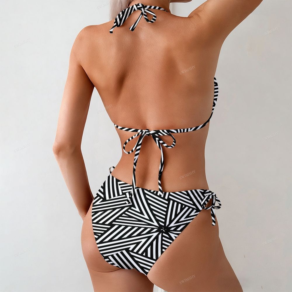 Black and White Geometric Stripe Print Halter Triangle Bikini