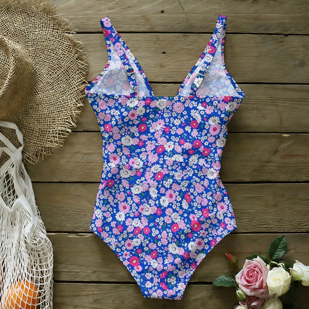 Blue Ditsy Floral Print Plunging V-Neck One-Piece Swimsuit