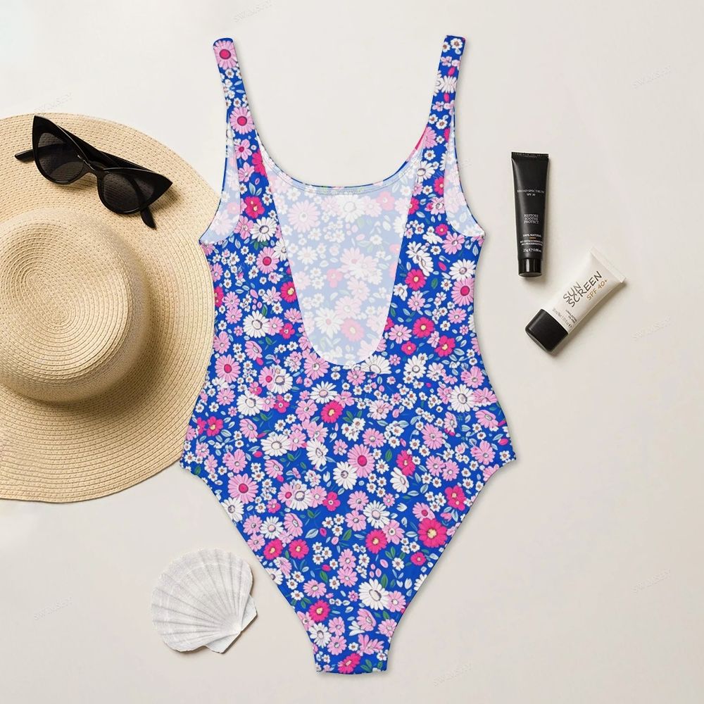Blue Ditsy Floral Print Deep U-Back One-Piece Swimsuit