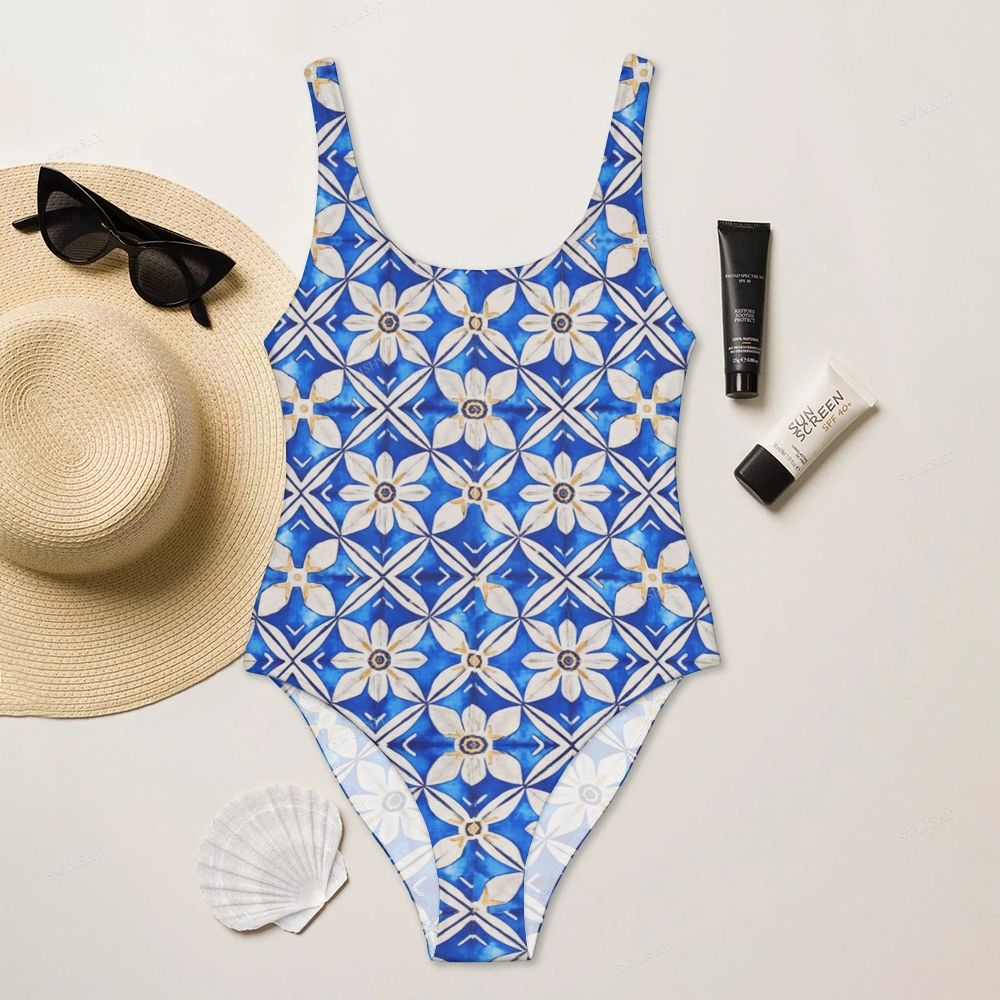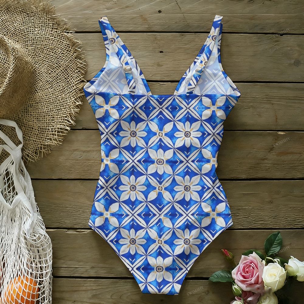 Azure Daisy Lattice Print Deep U-Back One-Piece Swimsuit