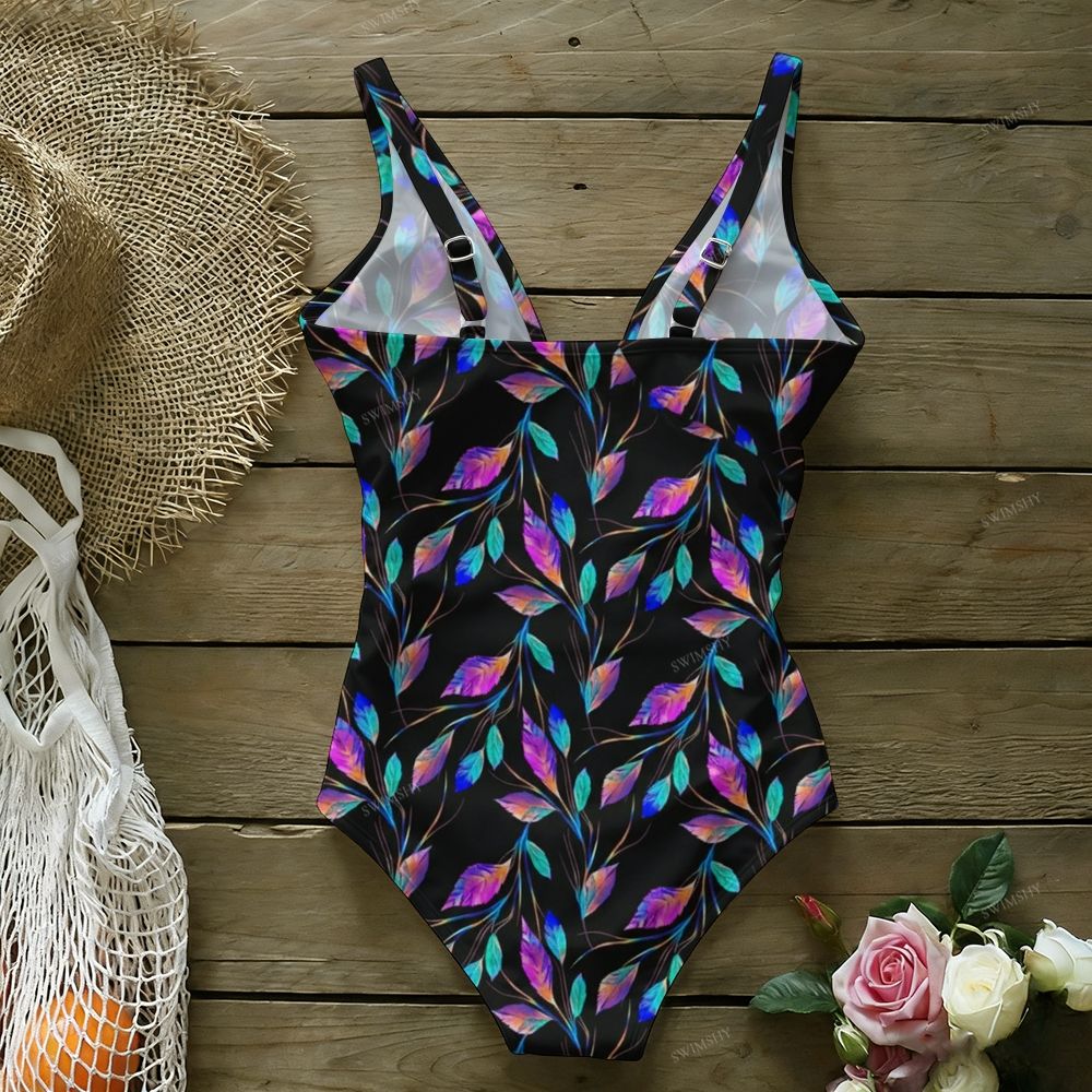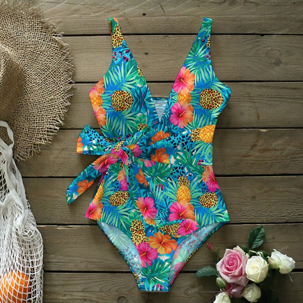 Colorful Tropical Floral Print V Neck Tie Back One Piece Swimsuit