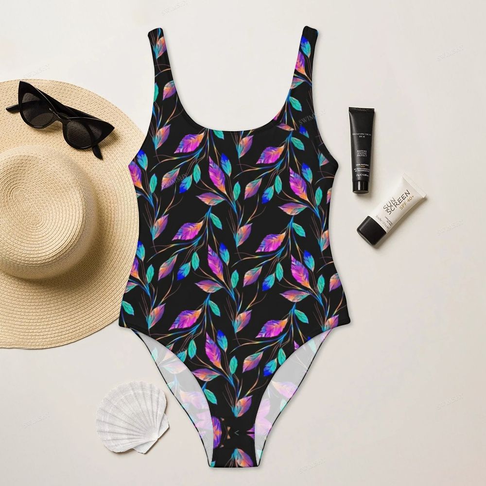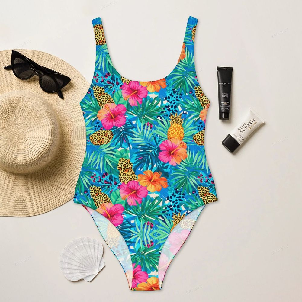 Colorful Tropical Floral Print Round Neck Back Zip One Piece Swimsuit
