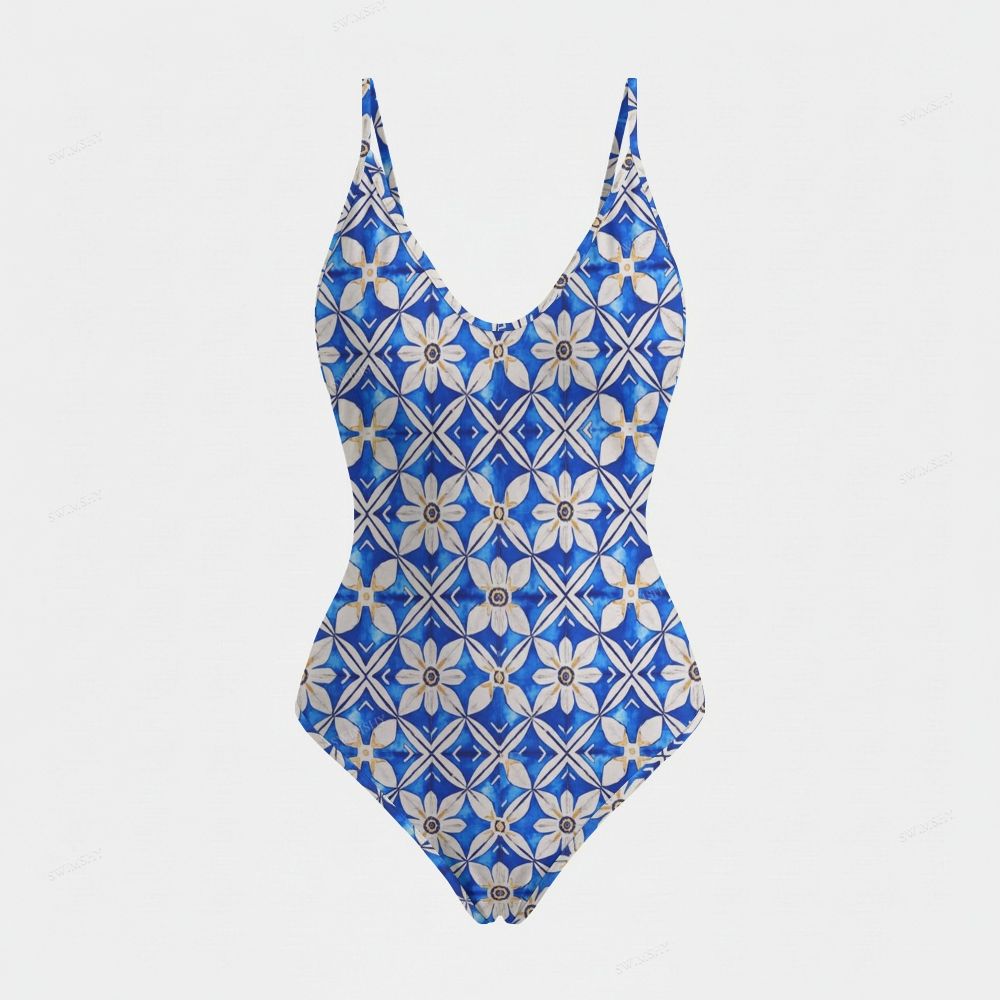 Azure Daisy Lattice Print Plunging V-Neck One-Piece Swimsuit