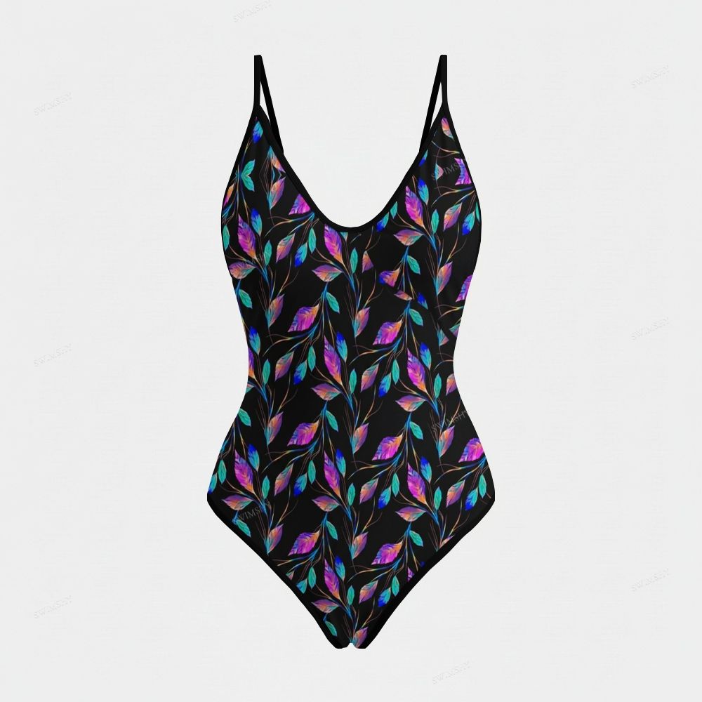 Black Iridescent Floral Print Plunging V-Neck One-Piece Swimsuit