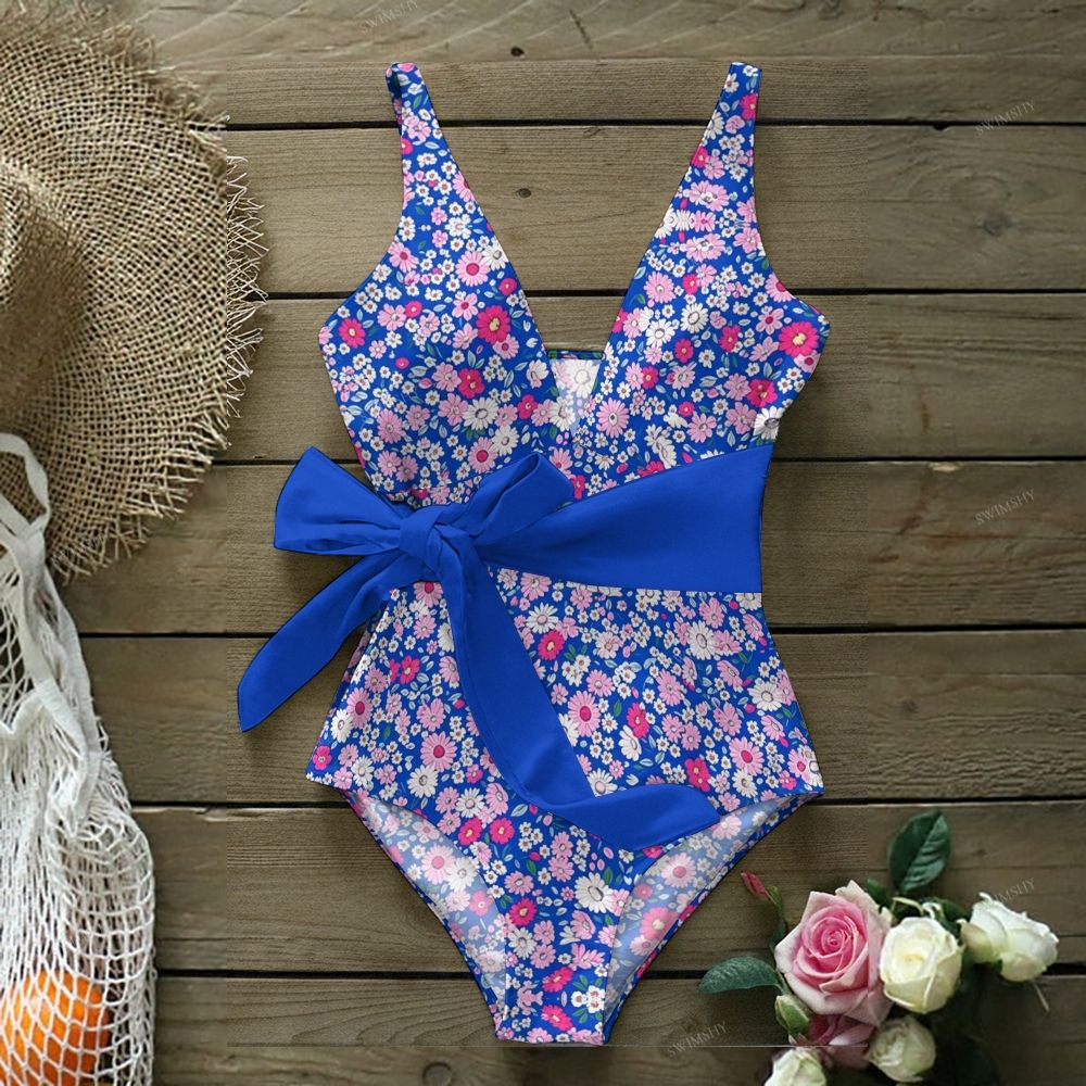 Blue Ditsy Floral Print Women's Bow Tie One-Piece Swimsuit