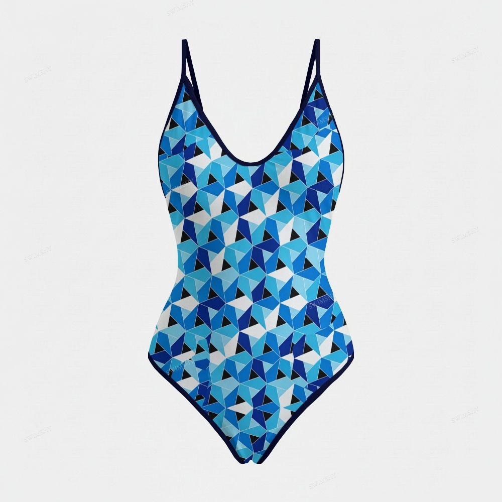 Blue Geometric Triangle Print Plunging V-Neck One-Piece Swimsuit