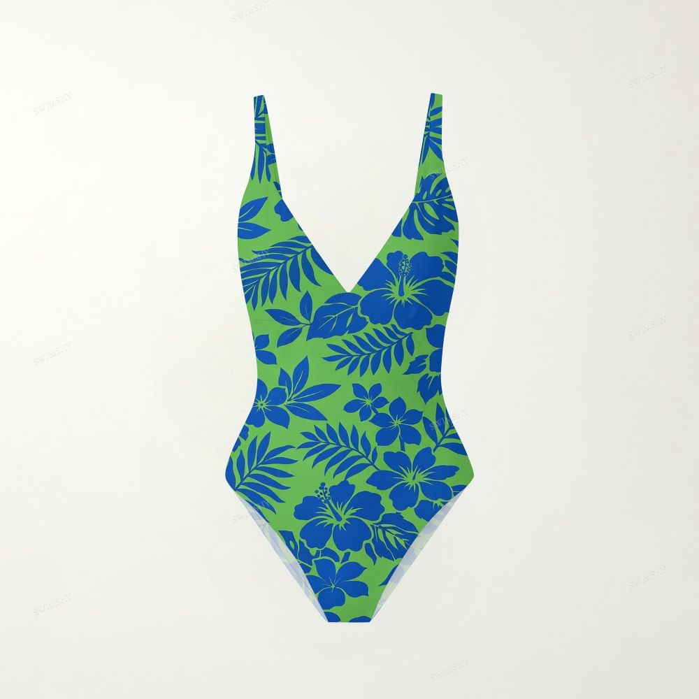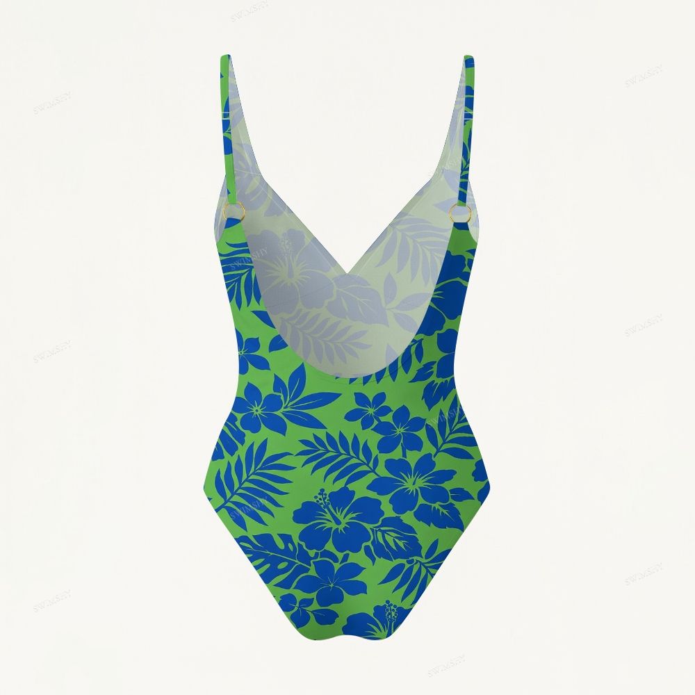 Blue Hibiscus Tropical Print V Neck Low Back One Piece Swimsuit