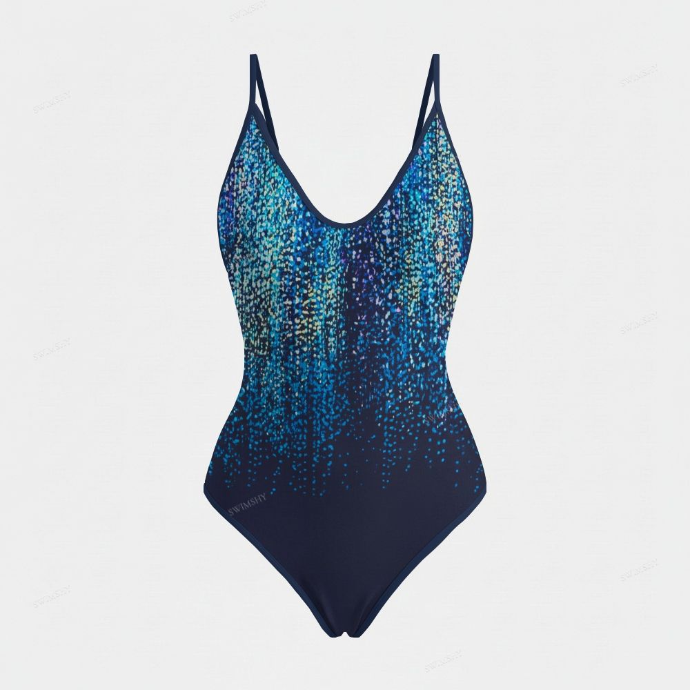 Blue Sparkle Gradient Print Plunging V-Neck One-Piece Swimsuit