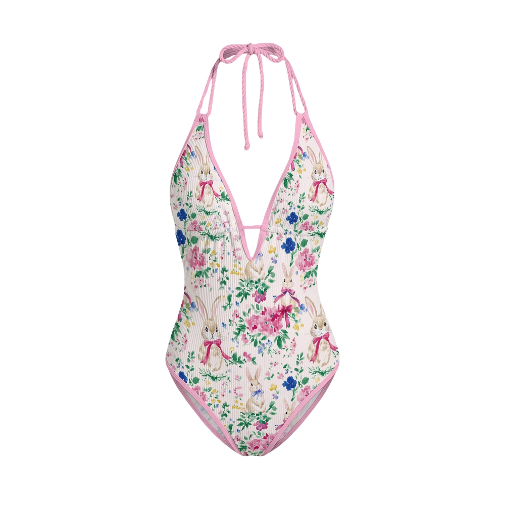 Easter Bunny Garden Print V Neck One-Piece Swimsuit