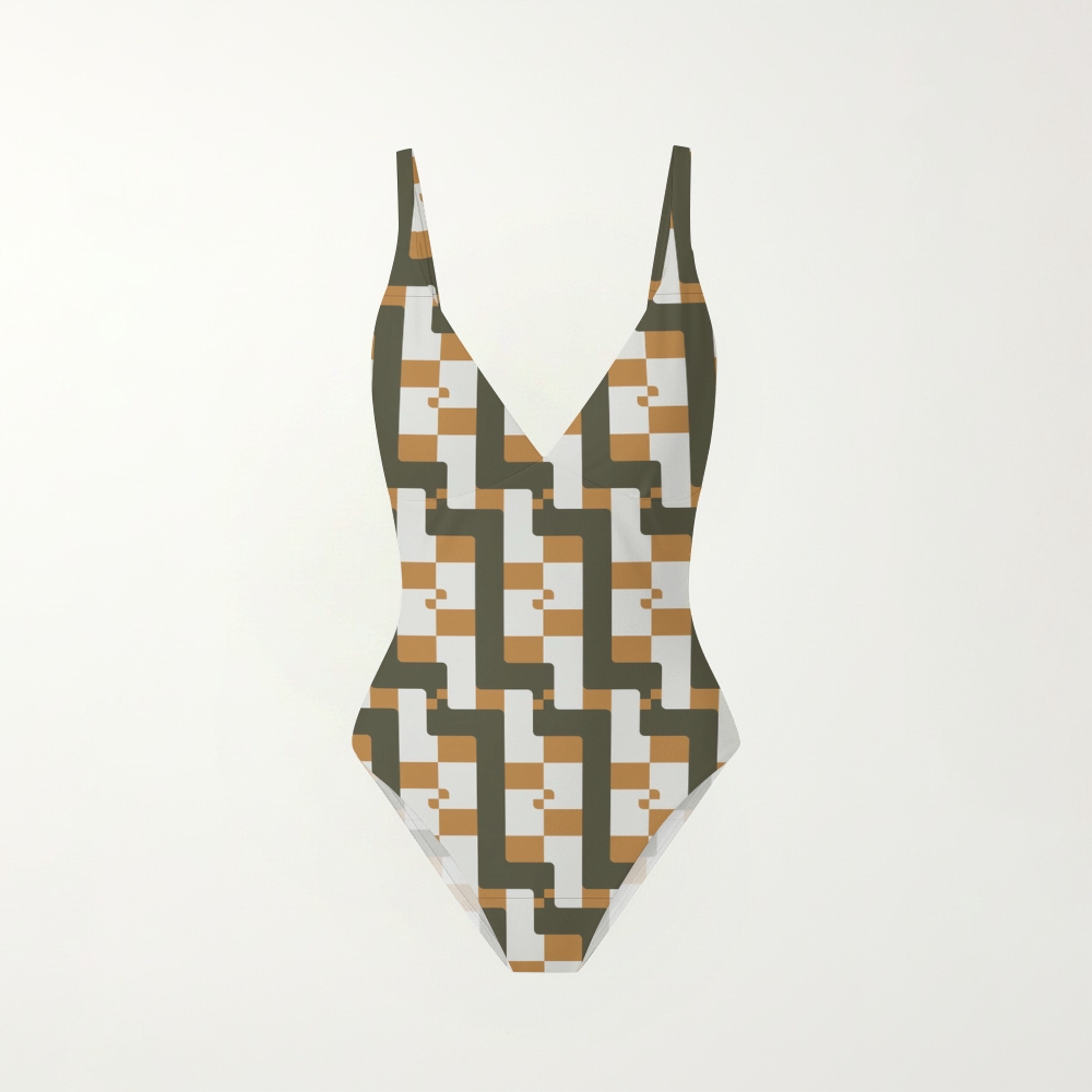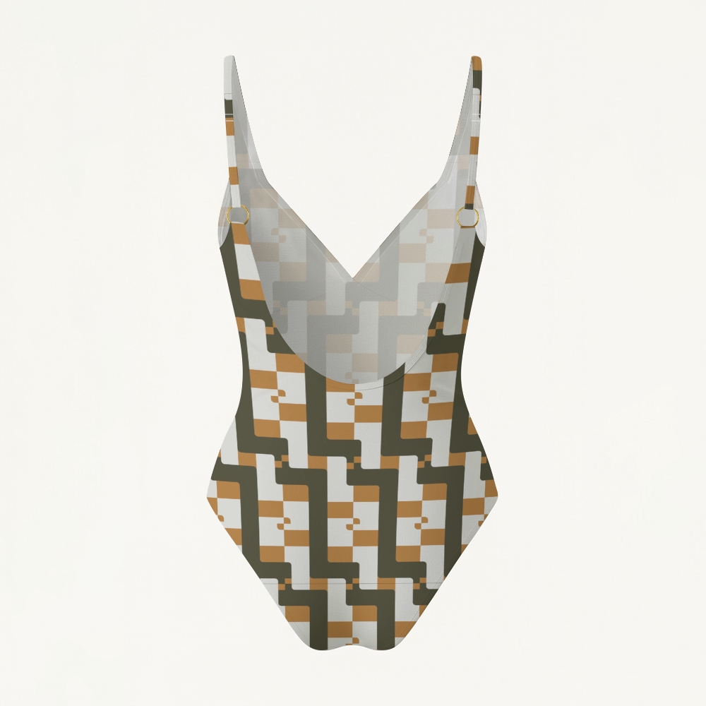 Olive Green Geometric V-Neck Backless One-Piece Swimsuit