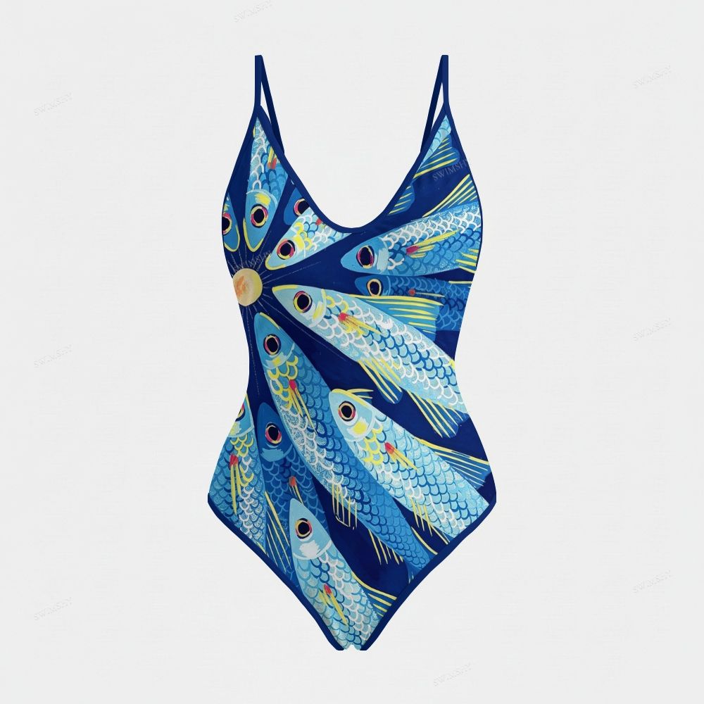 Tropical Blue Fish Print Plunging V-Neck One-Piece Swimsuit
