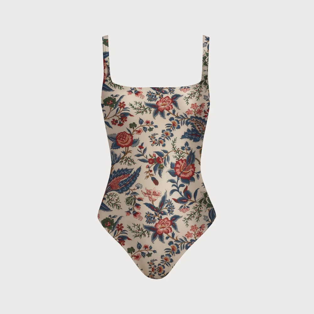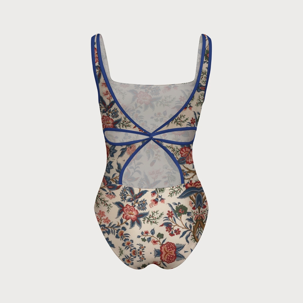 Vintage Floral Vine Print Square Neck Twist Cutout One-Piece Swimsuit