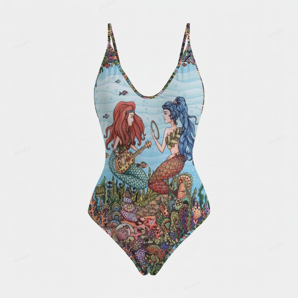 Whimsical Mermaid Art Print Plunging V-Neck One-Piece Swimsuit