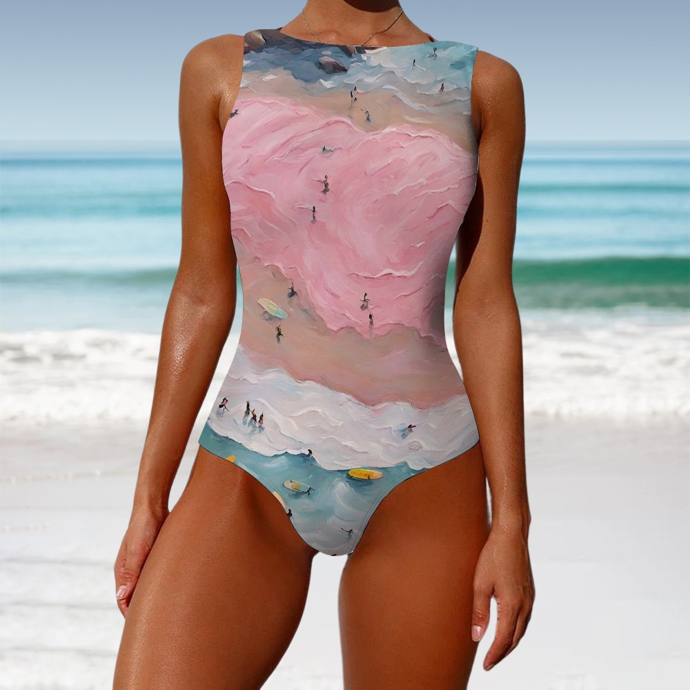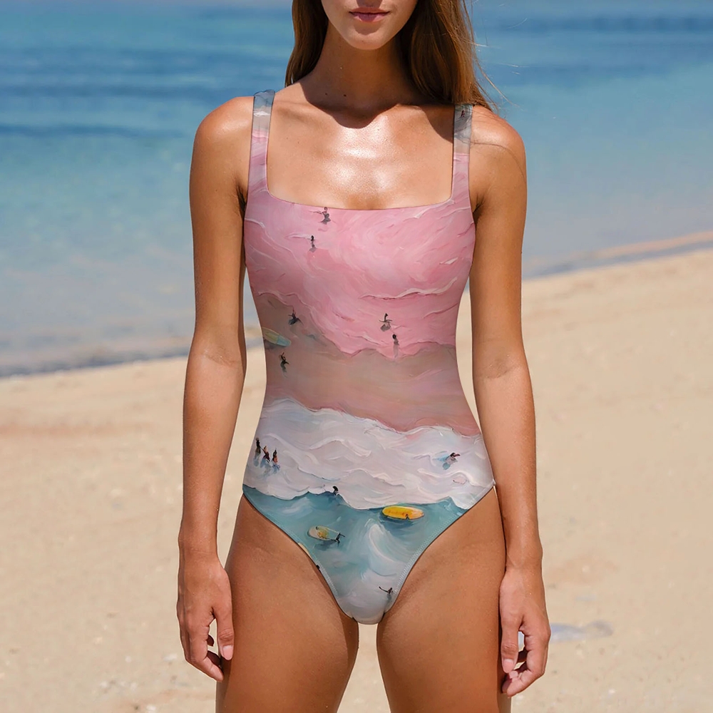 Pink Beach Oil Painting Print Square Neck Backless One Piece Swimsuit