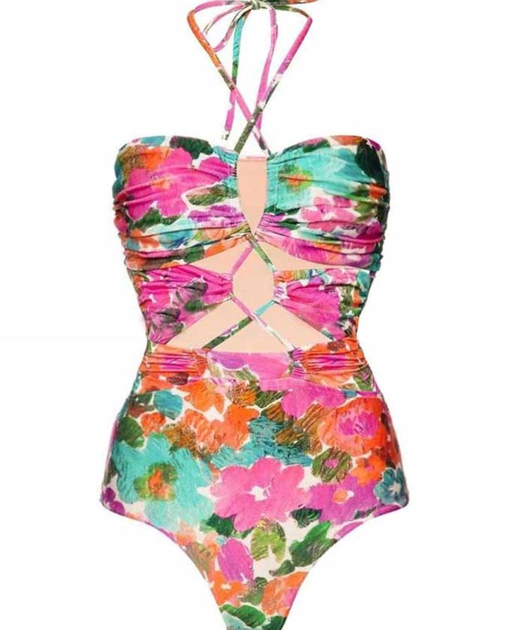 Halter Straps Cutout Floral Doodle One-Piece Swimsuit and Skirt