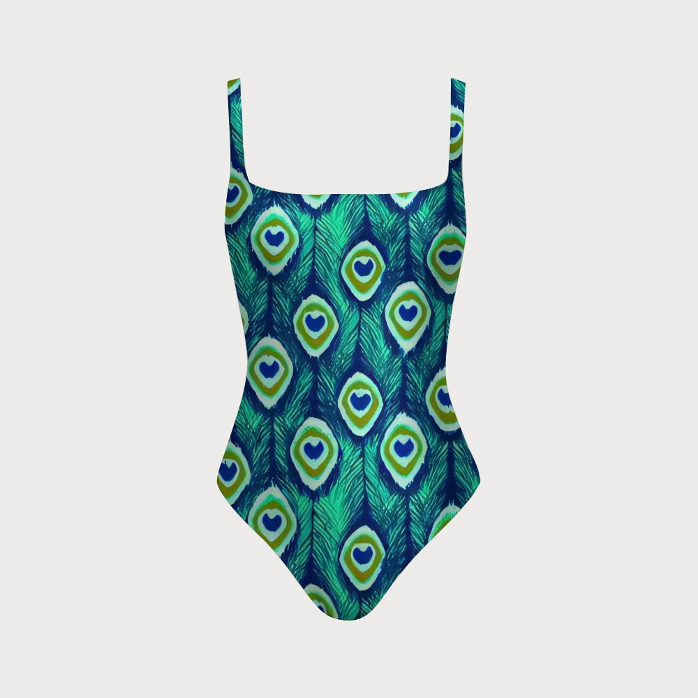 Peacock Feather Eye Print Square Neck Backless One Piece Swimsuit
