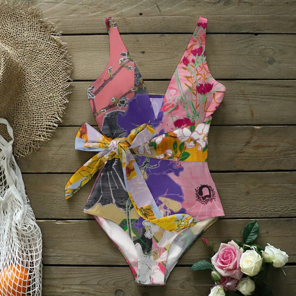 Women's Bold Abstract Floral Print Bow Tie One-Piece Swimsuit