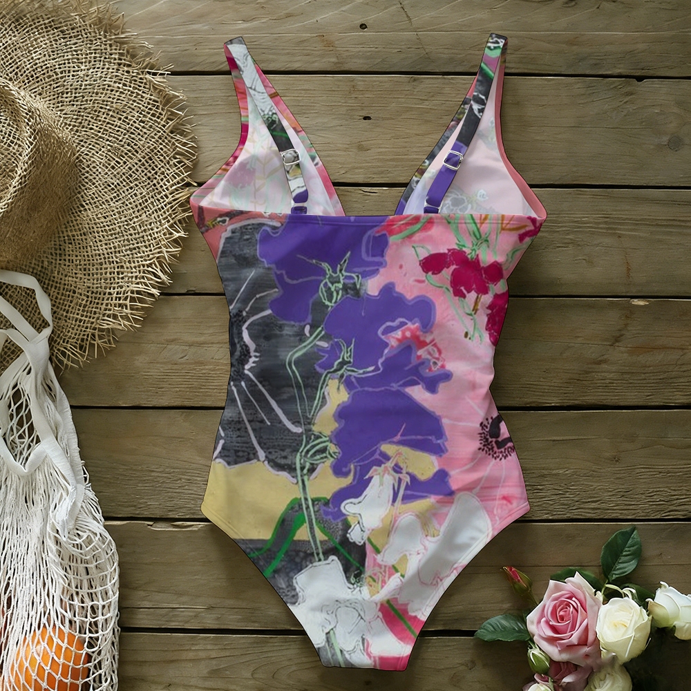 Watercolor Floral Beaded Print One Piece Swimsuit