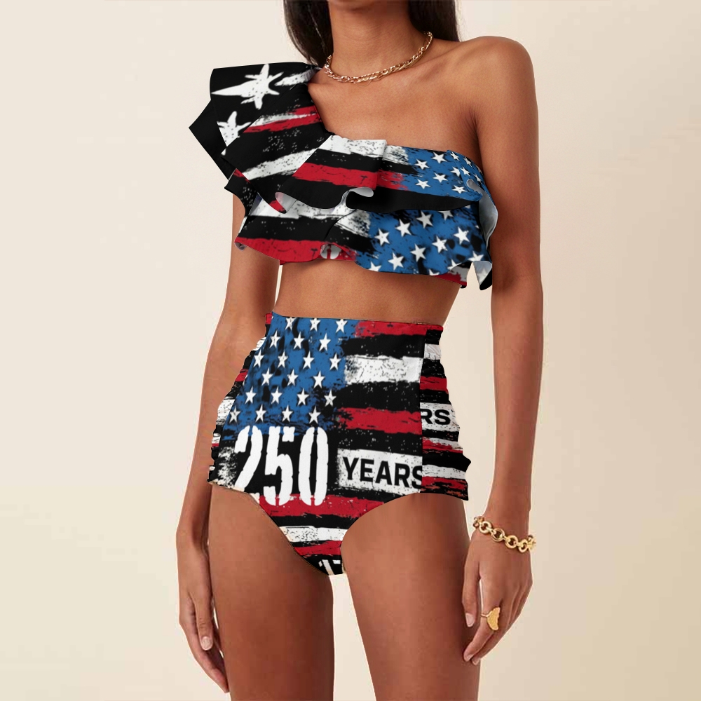 250 Years Distressed Flag Print One-Shoulder Ruffled Swimsuit Set
