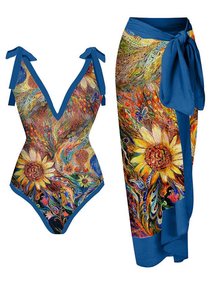 Vintage Abstract Print One Piece Swimsuit Set