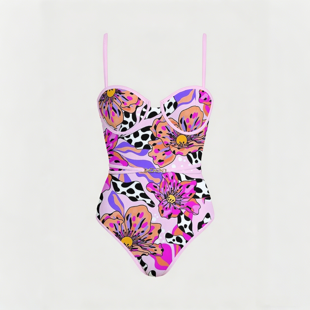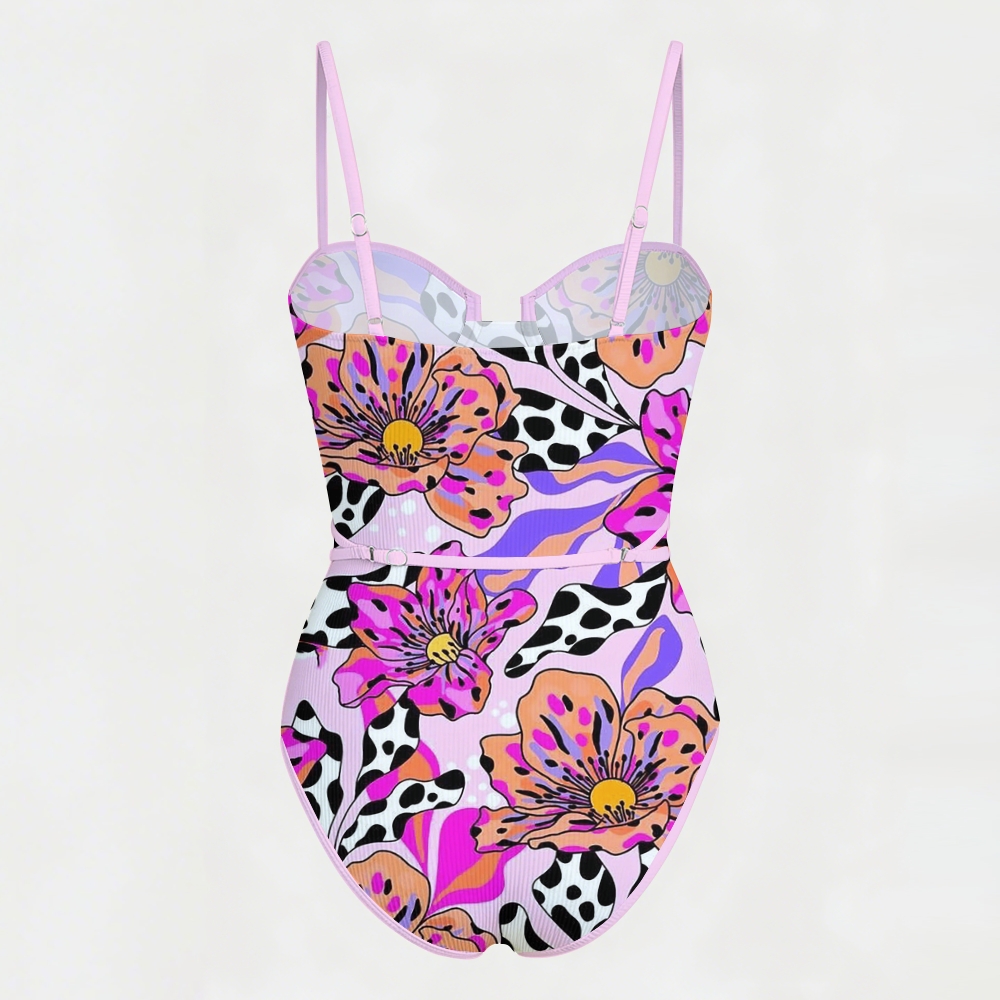 Abstract Floral Leopard Print Underwire Belted One Piece Swimsuit