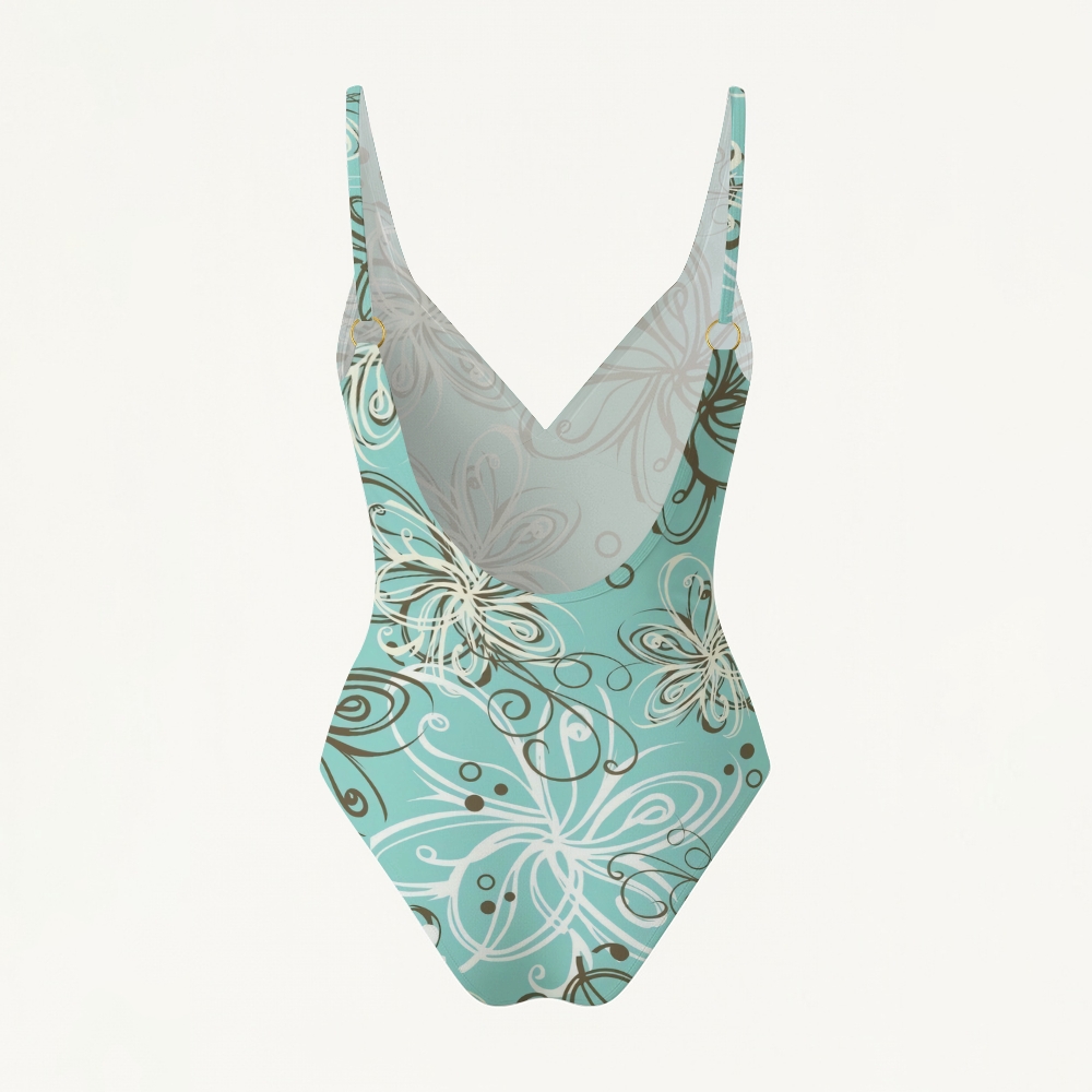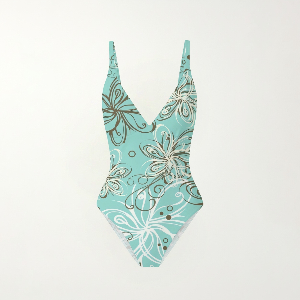 Abstract Floral Print Deep V Low Back One Piece Swimsuit