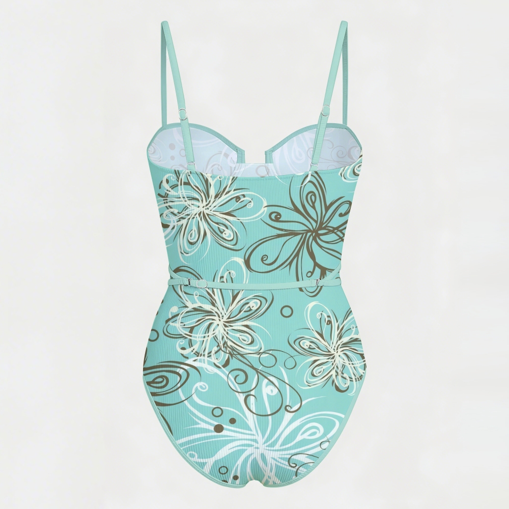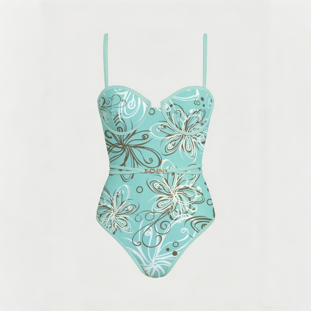Abstract Floral Print Underwire Belted One Piece Swimsuit