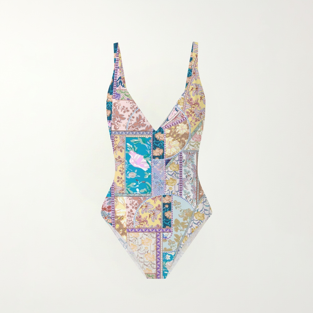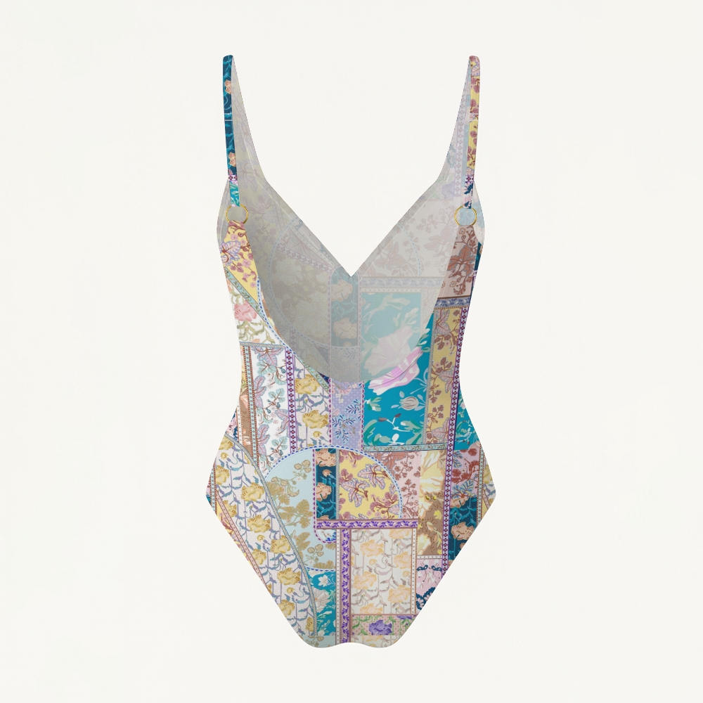 Bohemian Patchwork Floral V Neck Backless One Piece Swimsuit